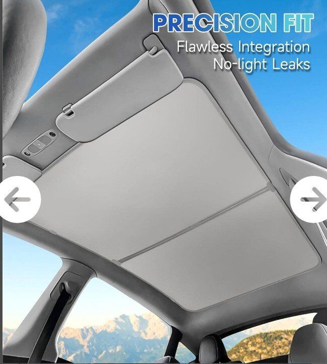 Tailor-made for Tesla Model Y 2024-2021 Panoramic Sunroof carefully designed roof insulated sun visors that blend seamlessly with the original car and provide a cooler driving experience with a dual-layer combination of high-density mesh fabrics and point-reflective layers. Good Sun Protection Featuring a foldable rigid frame and reflective sun visors designed to block two-thirds of the sun's heat load with superior reflective and UV protection for reliable protection. No Sagging Design Unlike other one-piece roof visors we use a two-piece spliced roof visor which effectively prevents sagging without affecting the appearance. Easy to install Tesla Model Y Sun Visor Accessory with 1 front and 1 rear sunroof visor 16 clips and a free zippered storage bag simply attach the visor with the UV reflective side facing upwards with front and rear markings and the clips snap into place for a quick and easy installation. Retractable & Foldable Easily retract and expand the sunshade easy to store install and adjust without any hassle making it as easy as possible for you to enjoy the best sun protection for your car's roof visor.