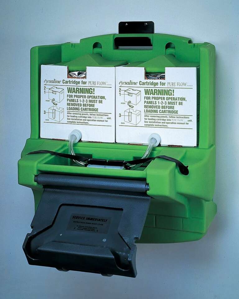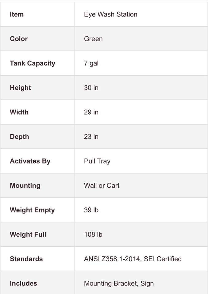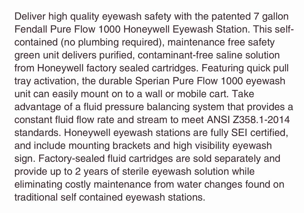 Description-Pure Flow 1000 emergency eyewash station, 7 gallon capacity, 15 minute wash time, 29” wide by 30” high by 17-1/4” deep. See photos for more product information and specifications.