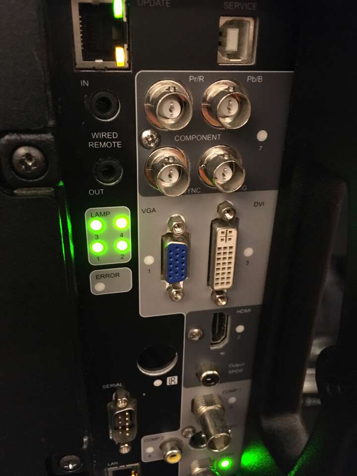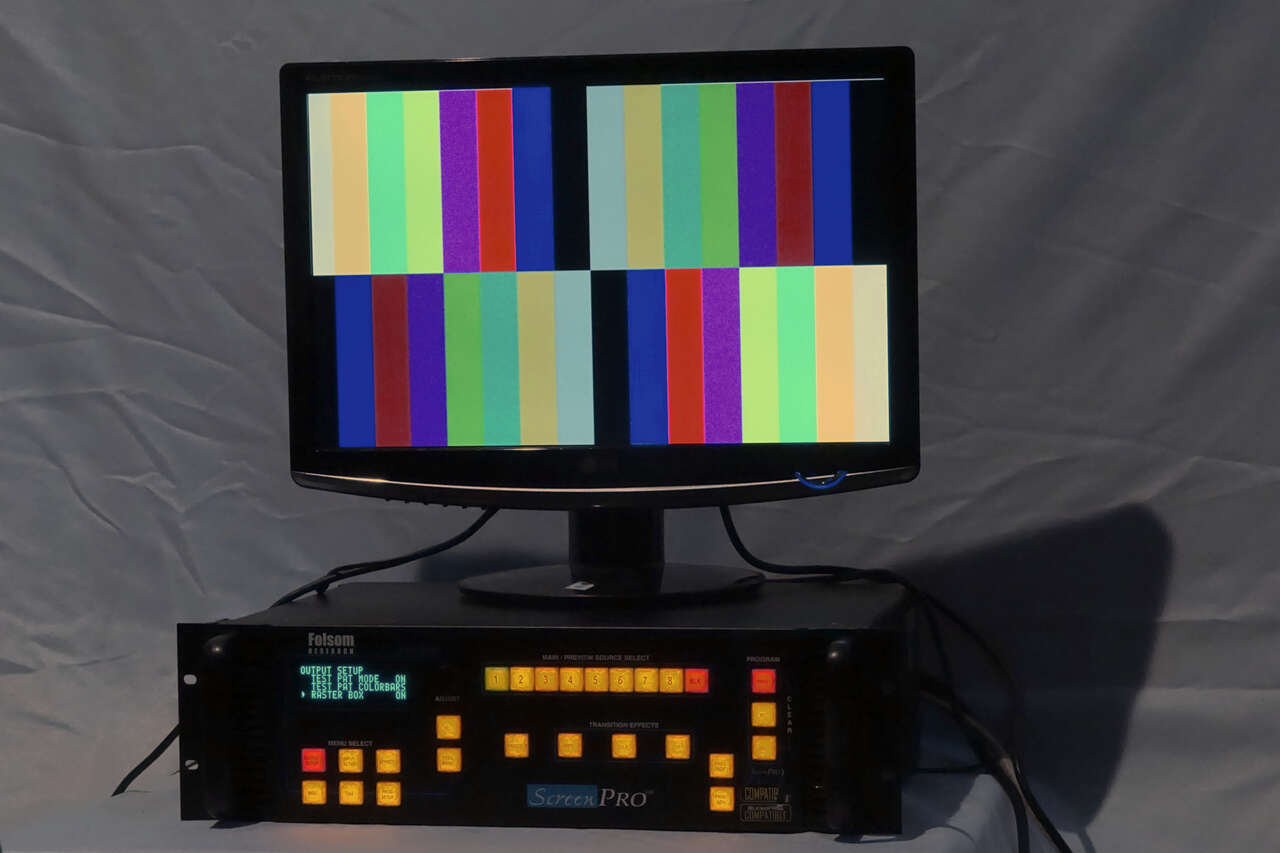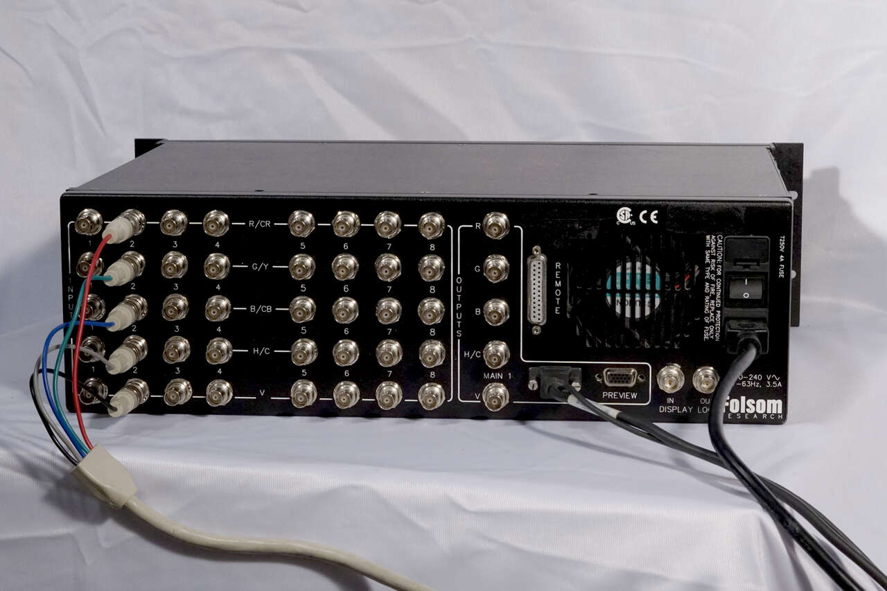 This monster is the best of XVGA AV Switchers. Well most AV is digital BUT almost every projector has VGA inputs still. See pix of input just taken from contemporary professional 10k projector. It is hard to tell from the pictures as cameras don’t capture screens well, but the image is crisp and color accurate. This switcher has 8 BNC Inputs and Parallel Preview and Main Outputs. Plus lots of switching tricks- a selection of crossfades and dissolves. Still (File) store, lots of format choices. It’s a real Pro rig. We don’t have any BNC/VGA fans to provide. Includes rack ears. Suggest you look up info on the internet for more information. Monitor shown is not included. It is very good condition and tested but sold As Is.