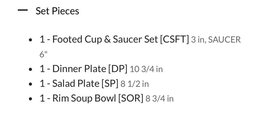 Set Pieces 1 - Footed Cup & Saucer Set [CSFT] 3 in, SAUCER 6 1 - Dinner Plate [DP] 10 3/4 in 1 - Salad Plate [SP] 8 1/2 in 1 - Rim Soup Bowl [SOR] 8 3/4 in