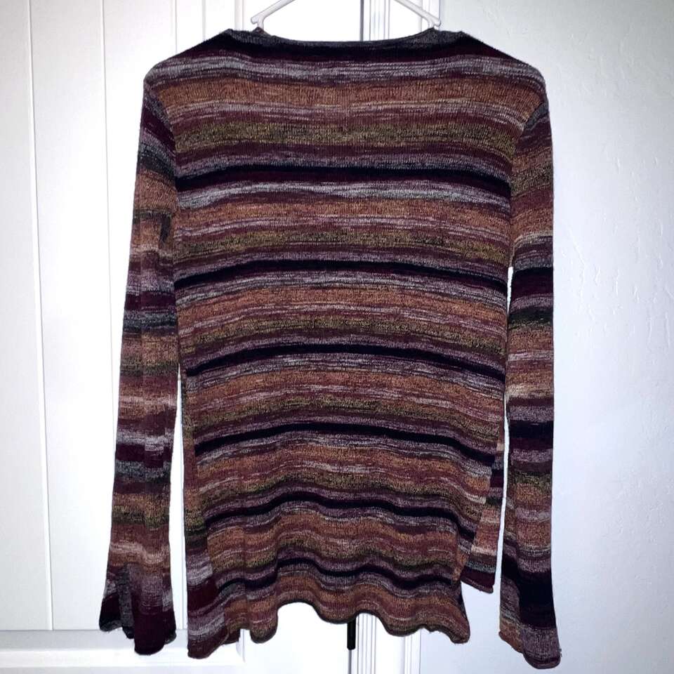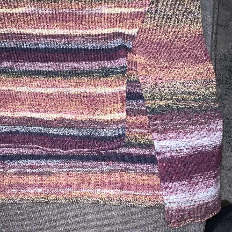 VenmoThis sweater-ish shirt is gorgeous! It is in like new condition. It's knit with natural fibers, but it isn't thick, so it's very flattering. It has a v-neck, hi-low hem, slit at the left side, and has slits at the sleeve hems. The colors are warm with a boho vibe. Sold out and hard to find. Approx measurements Armpit to armpit: 17.25 Back hem: 24.5 front hem: 21.5