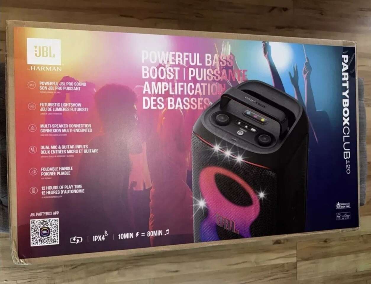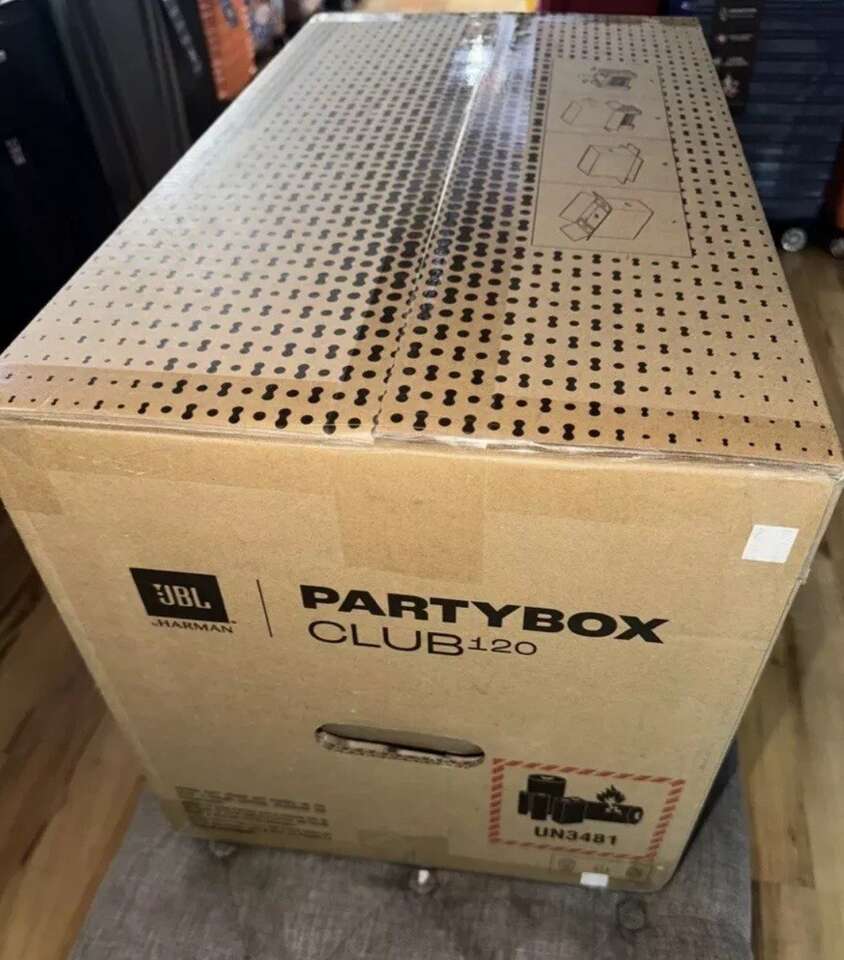 JBL PartyBox Club 120 - Portable Party Speaker with Foldable Handle, Powerful JBL Pro Sound, Futuristic lightshow, Up to 12 Hours of Play time, Splash Proof, Dual Mic & Guitar Inputs. NEW IN BOX.