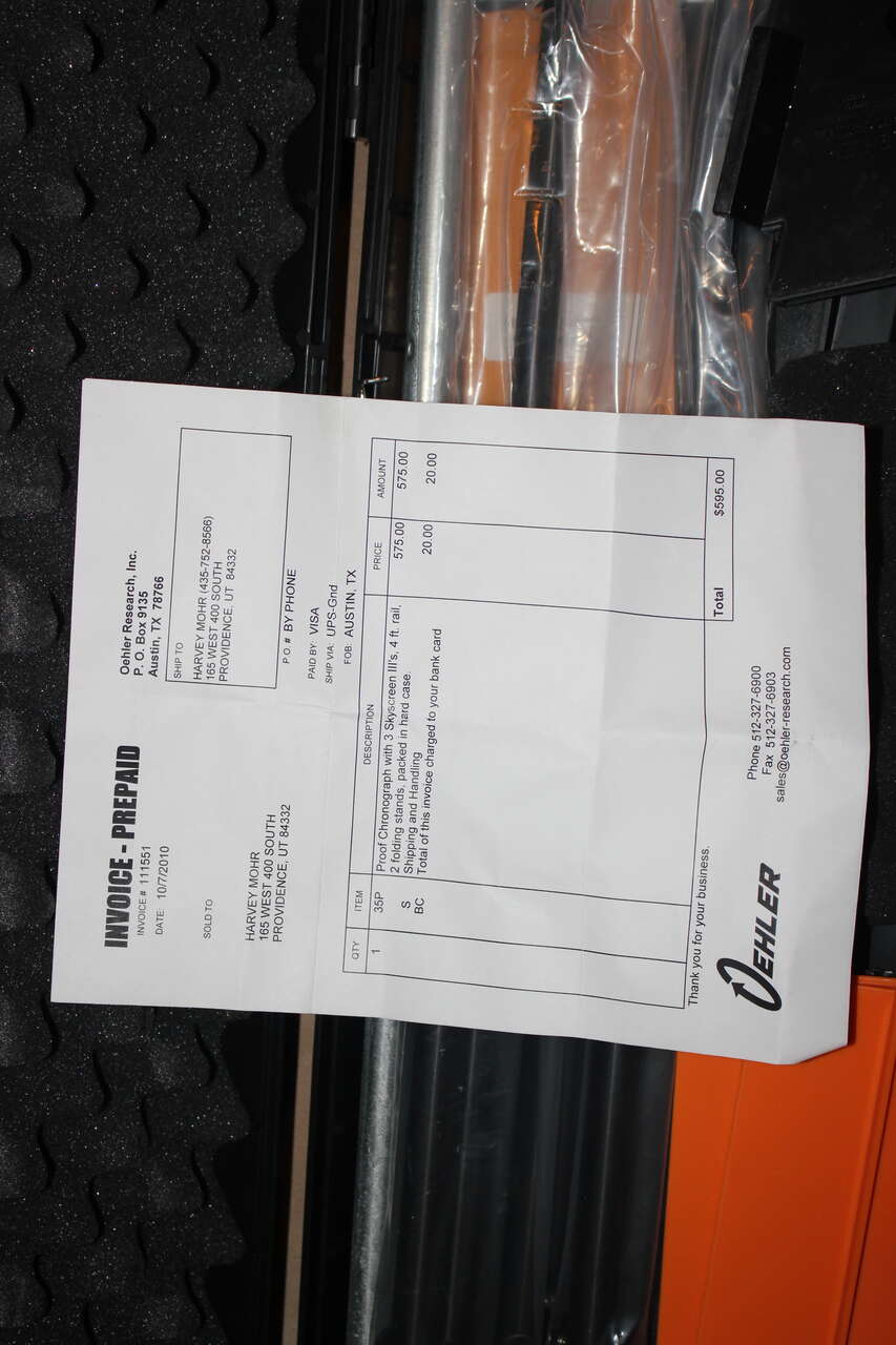 This one has never been unpackaged or out of the case at all, absolutely brand new. You can see the receipt price from 2010. Oehler is still in business and sells this same device on their website, parts are also still available. While this is more involved to set-up, the redundant accuracy of the 3 screens (actually measures two velocities every shot) and the printer are still features that none of the more modern chronographs can match.