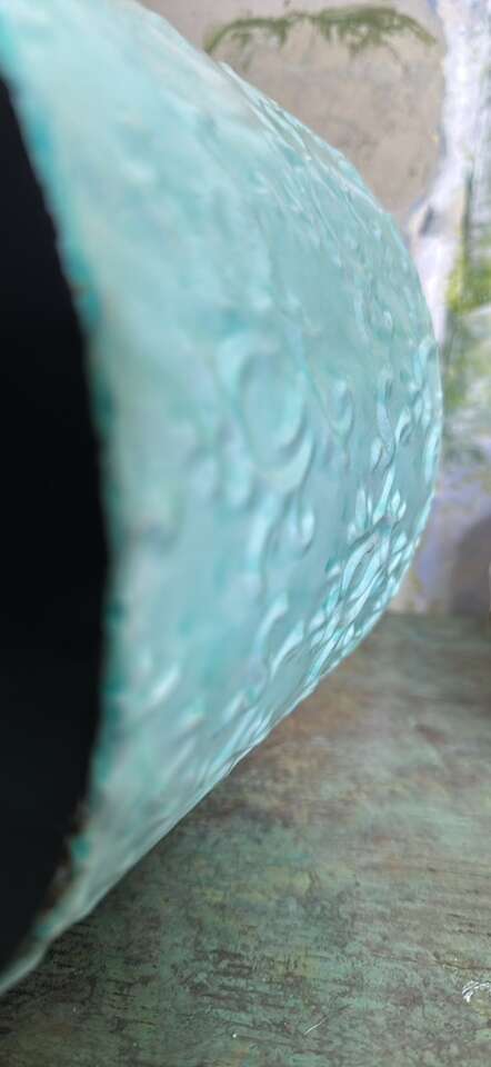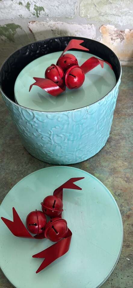 largest container height 9 1/2 x 8 1/2 wide. Raised design sea glasss green olive. There is an outer layer of enameled raised metal wrapped around us the metal container. There's been some hand work done to these