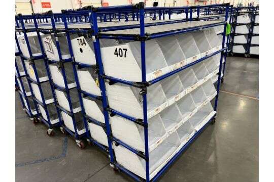 ZelleCreform pipe and joint system Warehouse Picker Carts are constructed of lightweight durable aluminum frame (blue) with 5 levels including divisible compartments on 4 levels. Caster wheels designed for optimal and smooth movement are ideally suited for both order picking or kitting operations in narrow aisles.