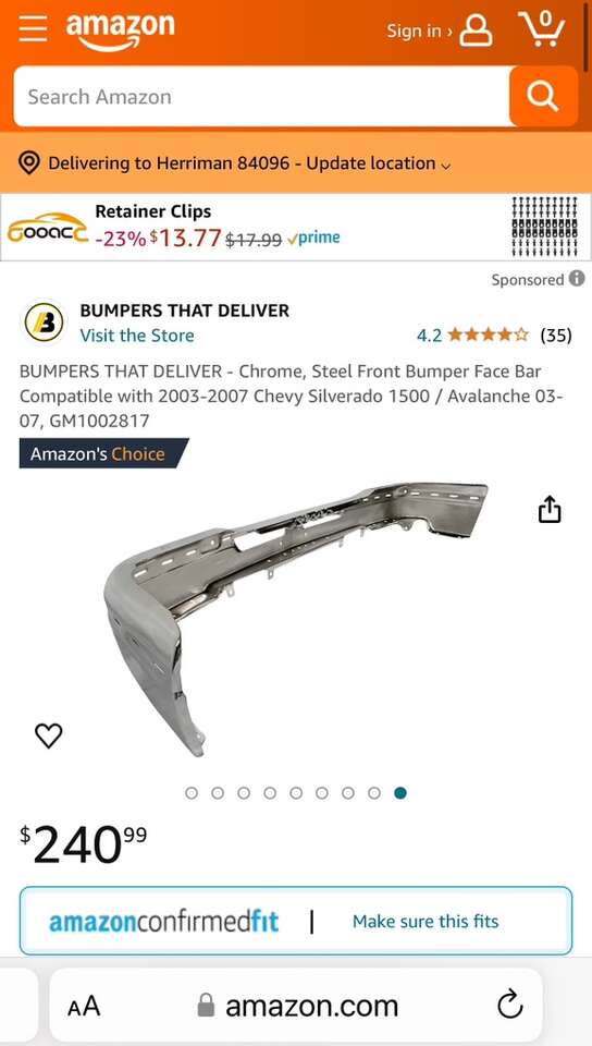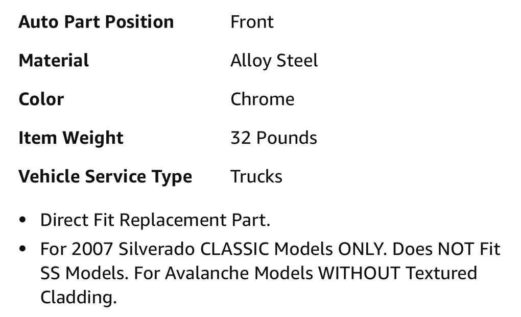 Description- Front chrome steel bumper for 2003-2007 Chevy Silverado 1500 and 2003-2007 Chevy Avalanche. I have TWO of these available. BOTH ARE BRAND NEW IN THE BOXES, BUT ONE OF THEM DID SUSTAIN A MINOR SCRATCH DURING SHIPPING. See photos for more product information and specifications.