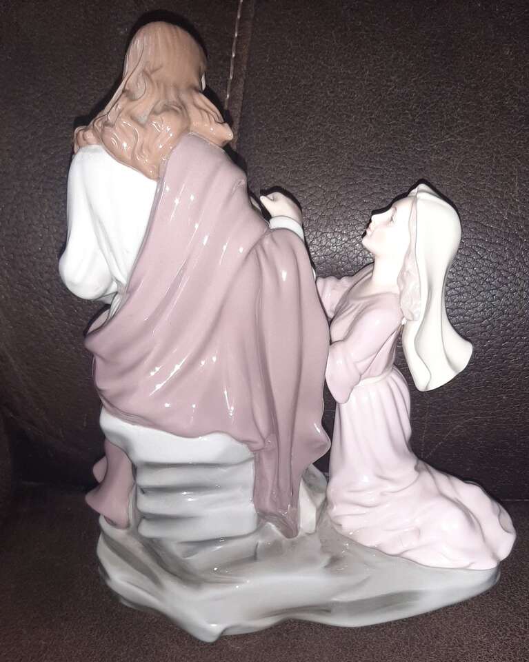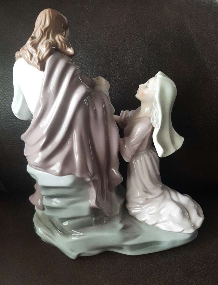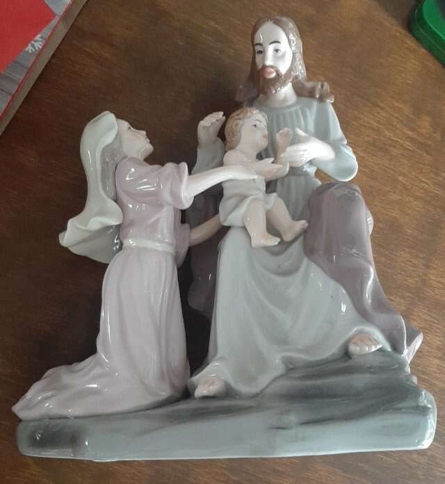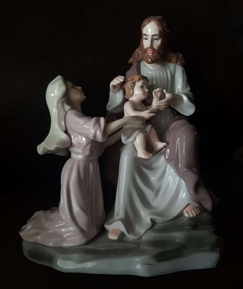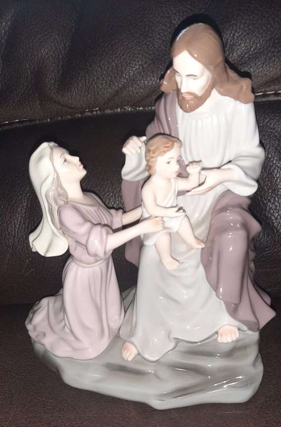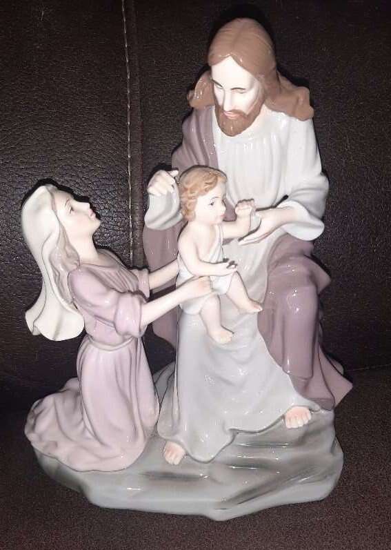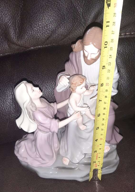 Beautiful condition, hand painted, delicate pastel colors. Seated Jesus, kneeling mother, (Mary?), seated child. Ceramic and glossy glazed. Large 9x11 inch size. Perfect condition, no cracks or chips etc. Smoke free home.
