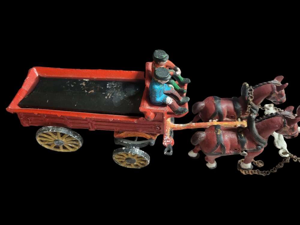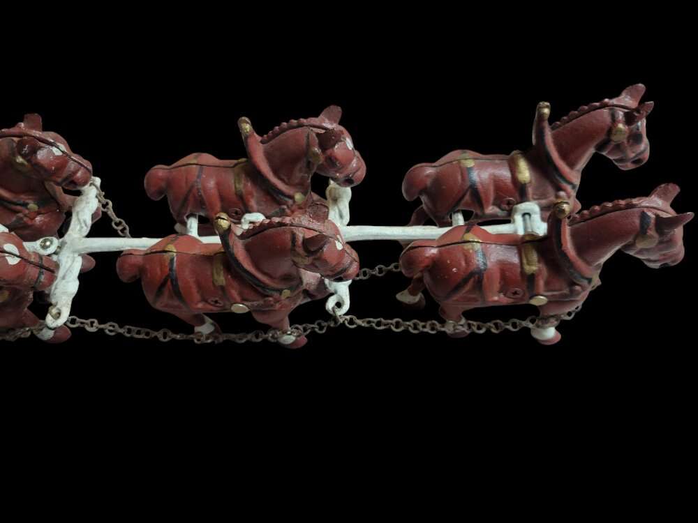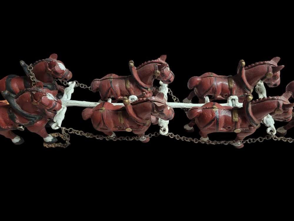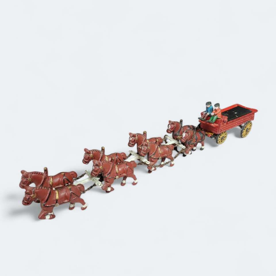 VINTAGE CAST IRON TOY BEER WAGON, 2 RIDERS, 8 CLYDESDALE HORSES. inf 702 3558824