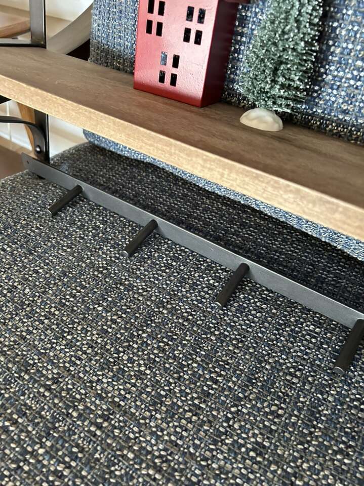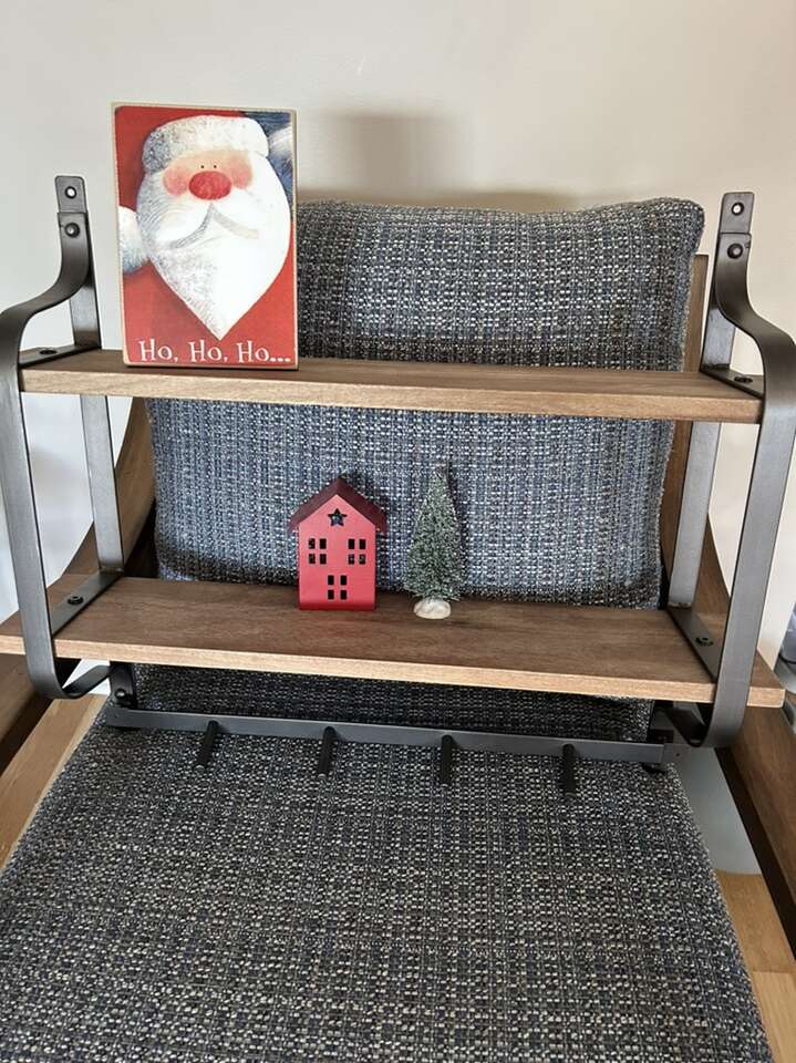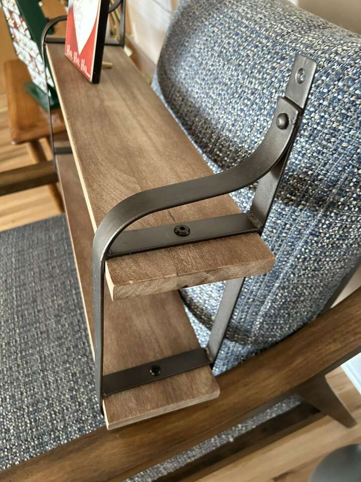 Darling wood and iron shelf, purchased from Pottery Barn. Would be cute in a bathroom or entryway. Also has metal pegs to hang things on! 20 1/2 inches tall 24 inches wide 5 inch deep shelves