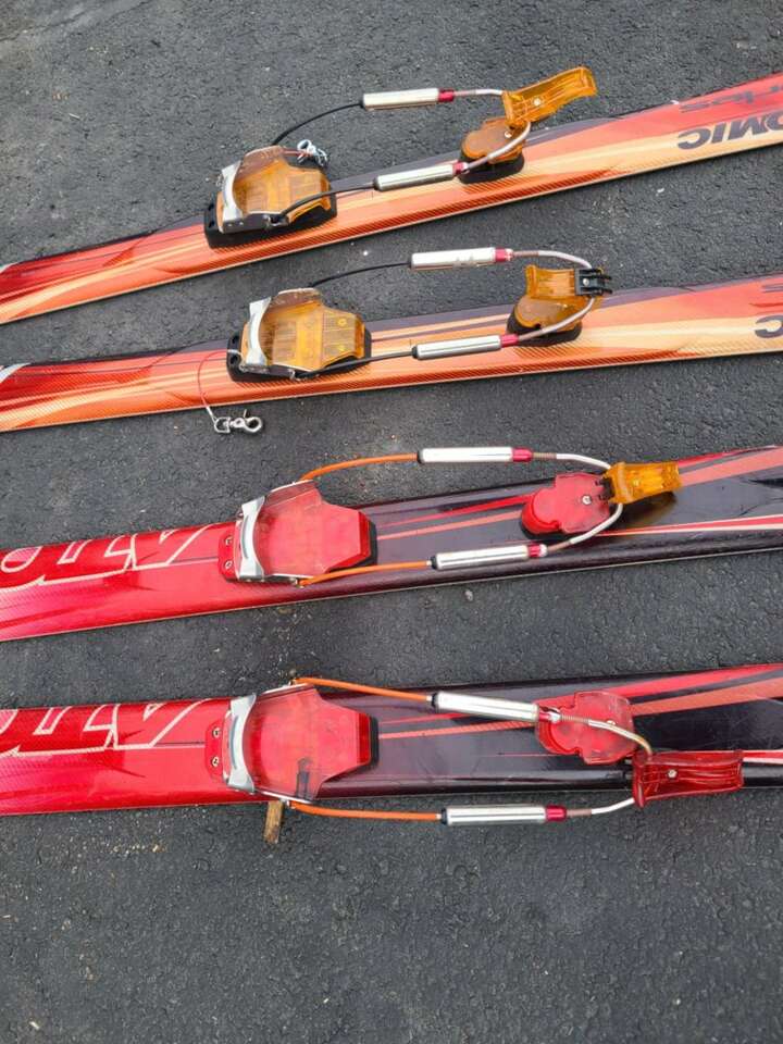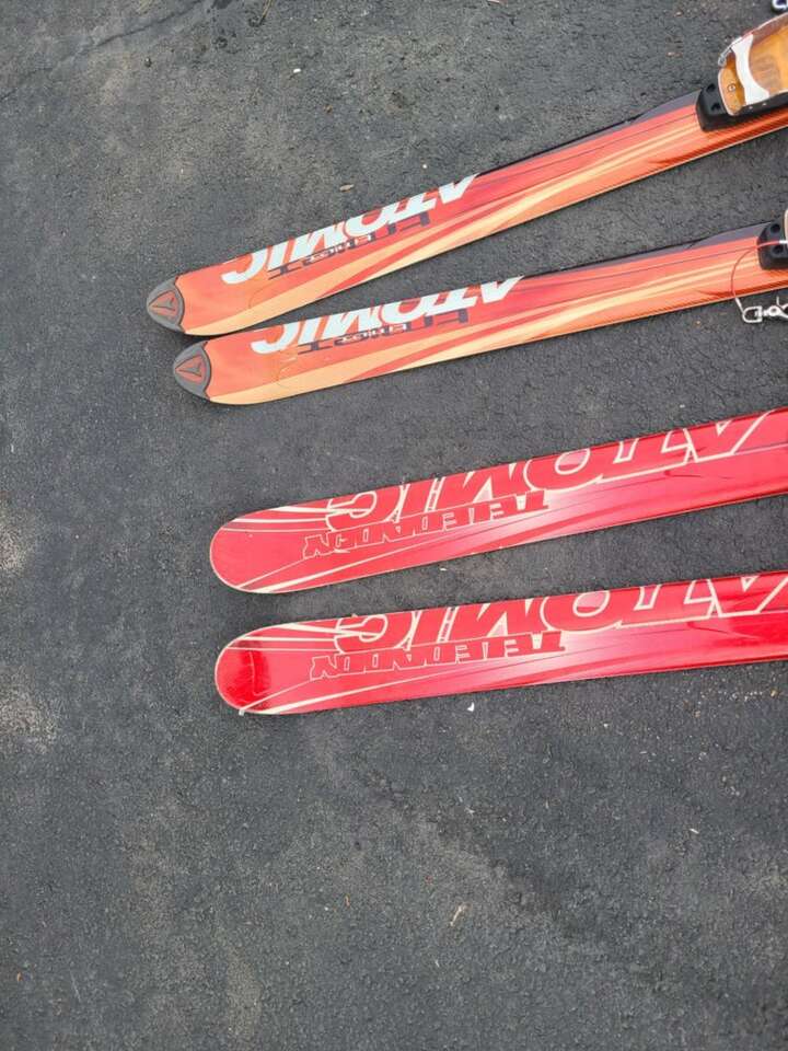 On the left is SOLD! Red Atomic Teledaddy 173cm, sidecut 116 99 126. $250 SOLD