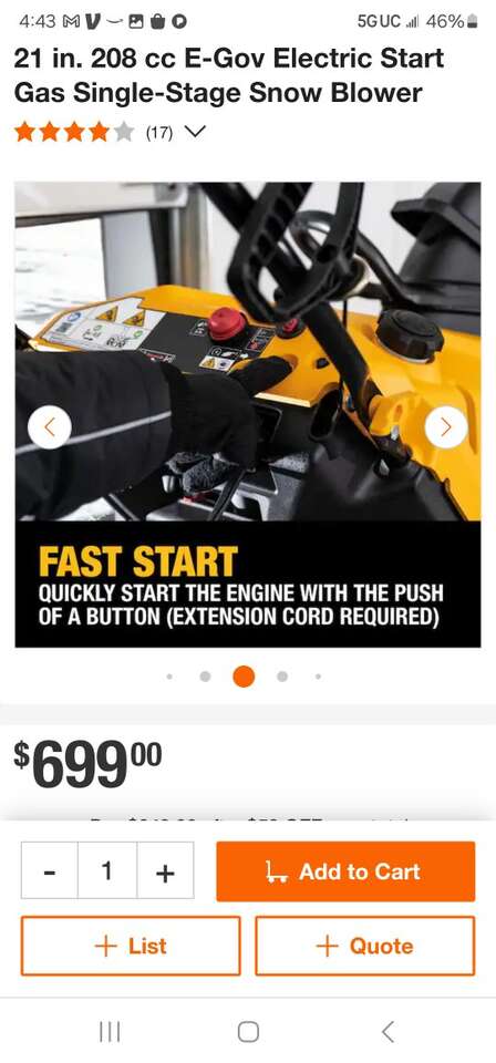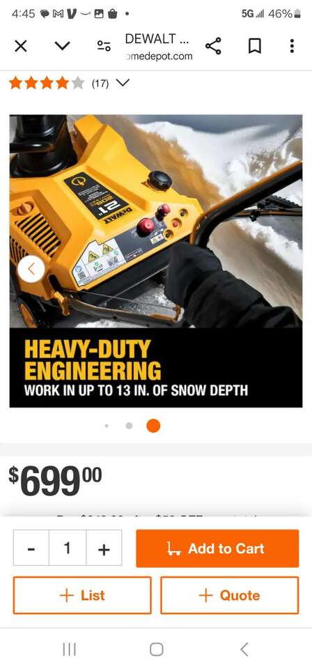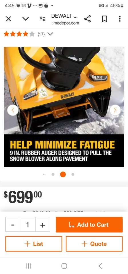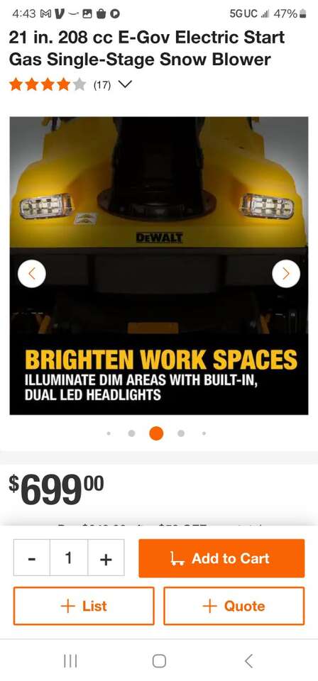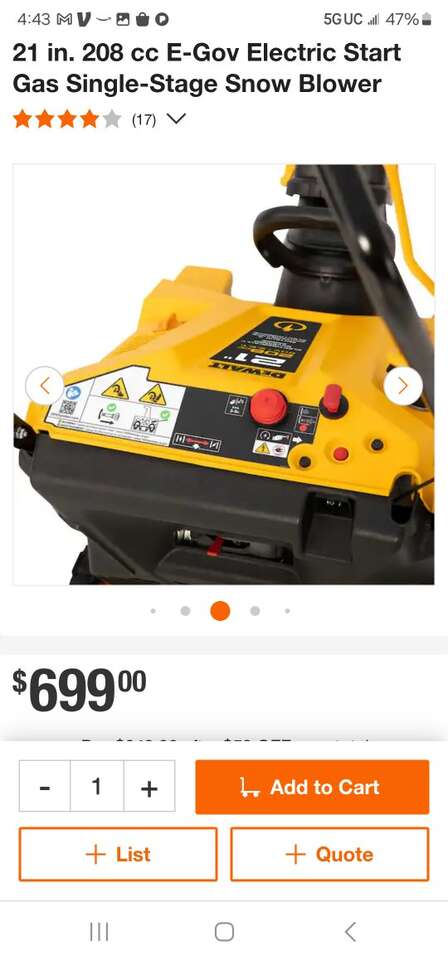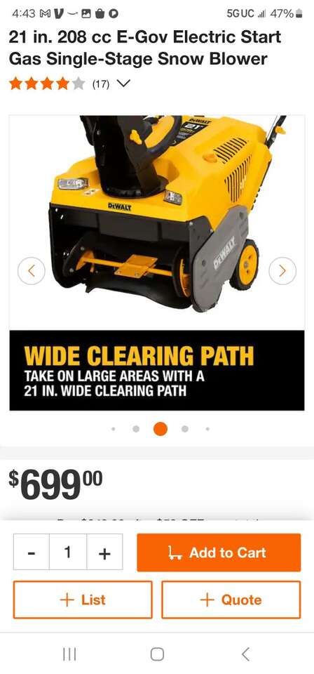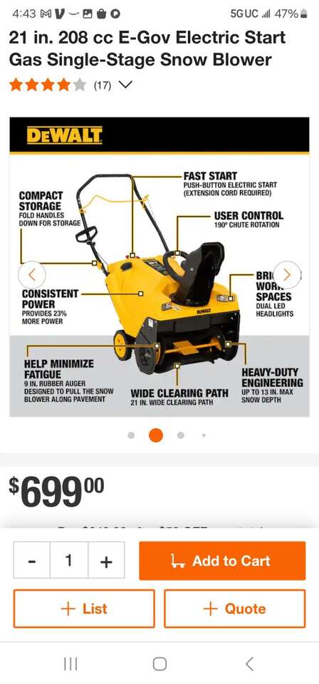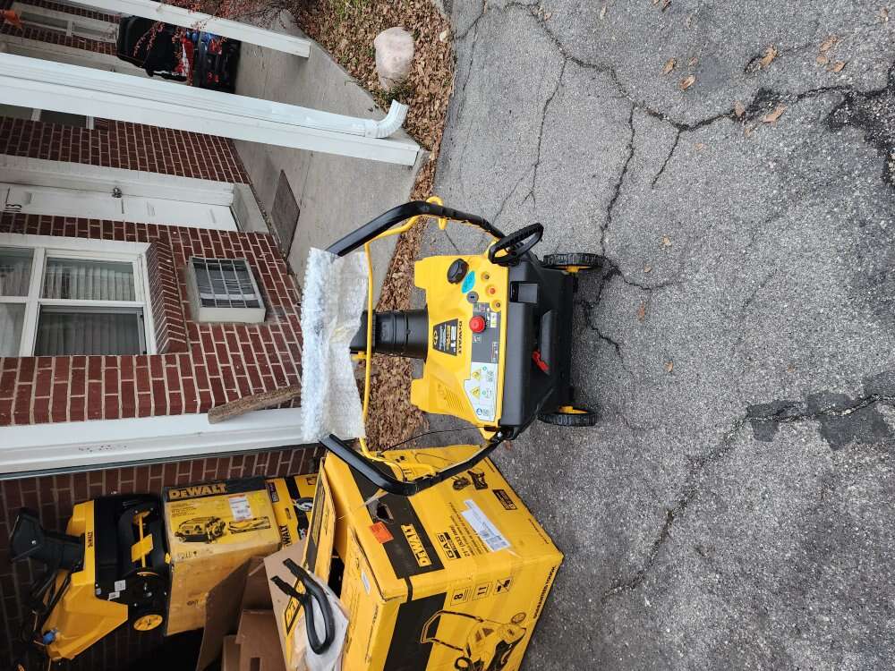 ZelleUsed, like new, Dewalt 21in. 208CC E-gov Electric Start Assist Gas Single Stage Snow Blower. Make clearing snow easier this winter with this Dewalt snow blower. It has electric start assist, so if you plug it in, you can start it with a push of a button. With bright lights, you can see what your working on in any conditions. Home Depot sells this for $699, I'm asking $500. Model Number DW31PM2V6HA38.