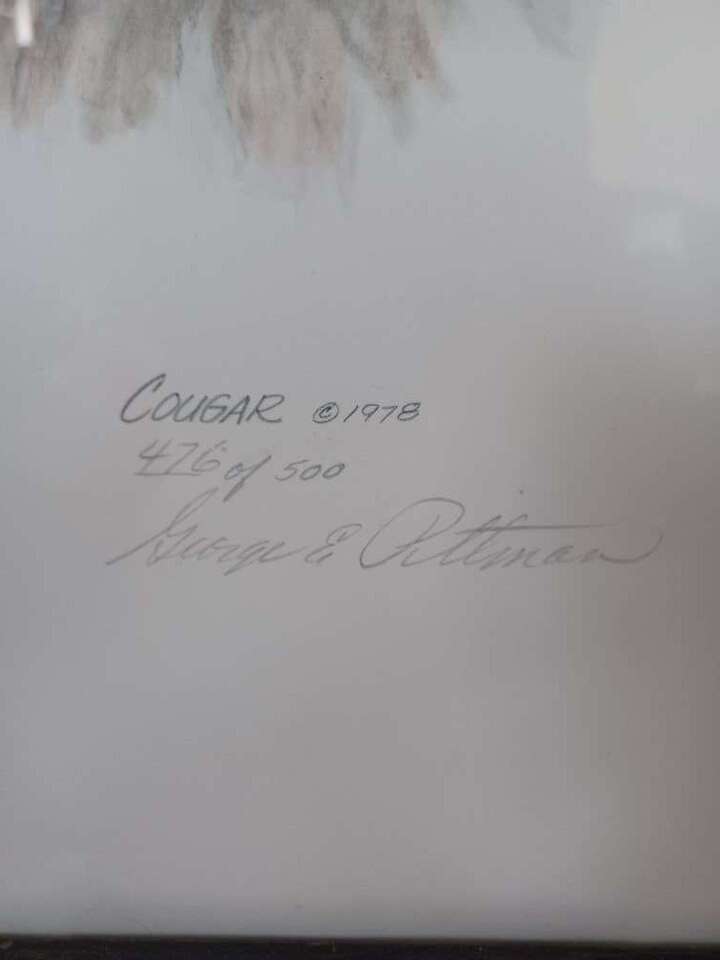 Cougar Vintage Original Dated: 1978 Numbered: 476 of 500 Signed by artist: George E. Pittman. Slight water damage on botton. A new mat would cover it. FCFS Cash only.