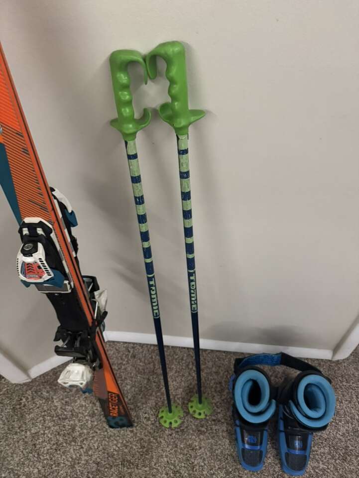 Skis: 166 cm Poles: 116 cm Boots: 282 mm (Women’s 7/Men’s 6)