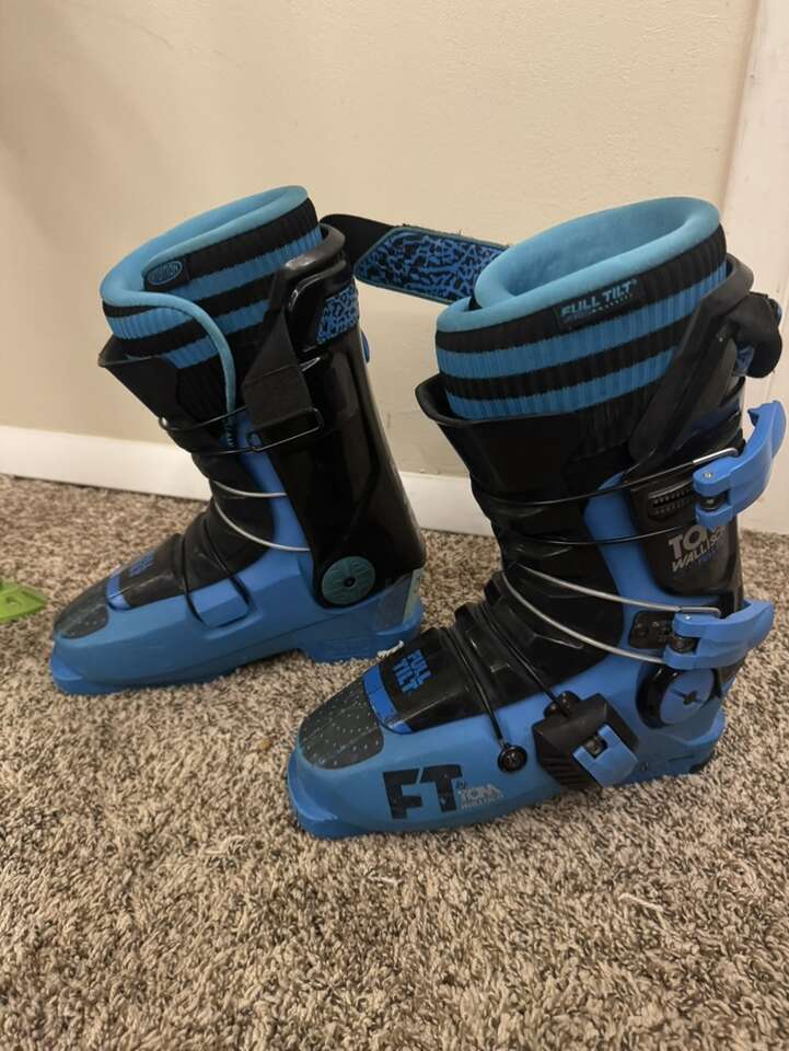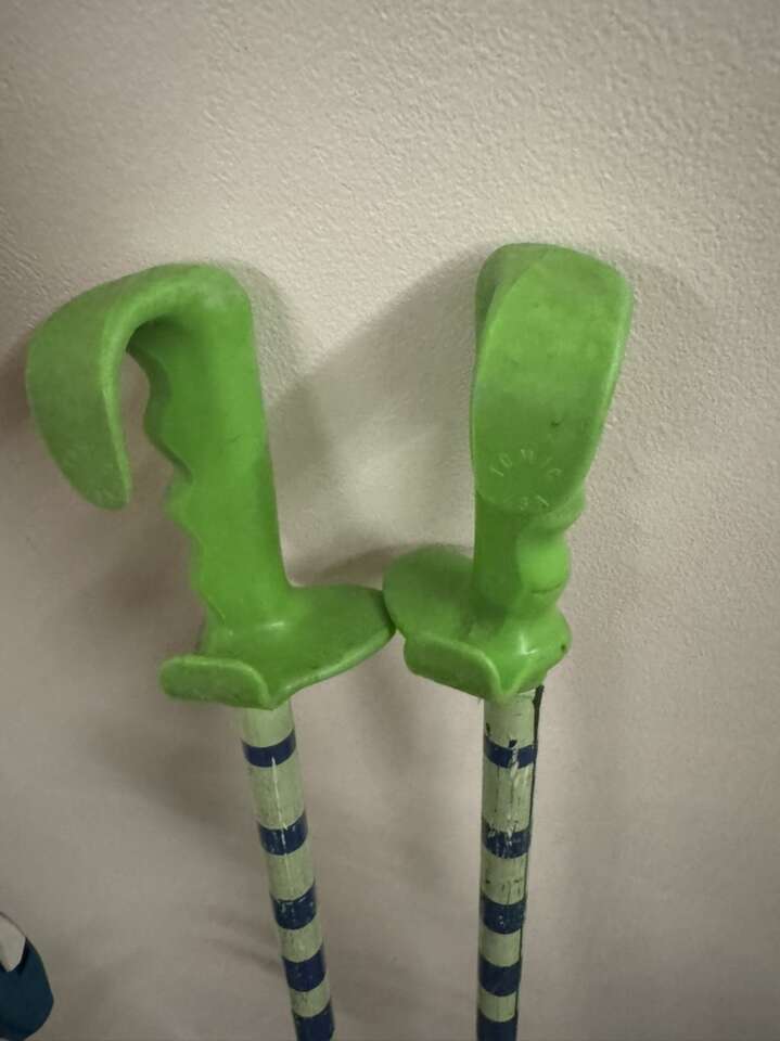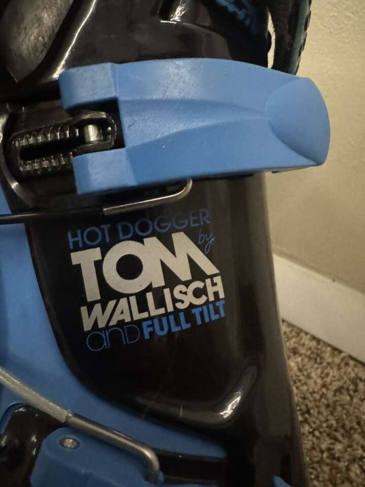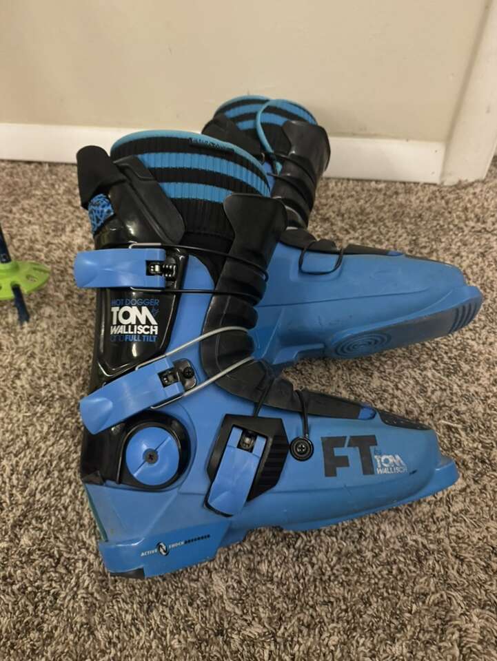 Volkl RaceTiger World Cup 166cm Speedwall skis. Green and blue Tomic poles. Hot Dogger Full Tilt Tom Wallisch Flex 6 Boots.