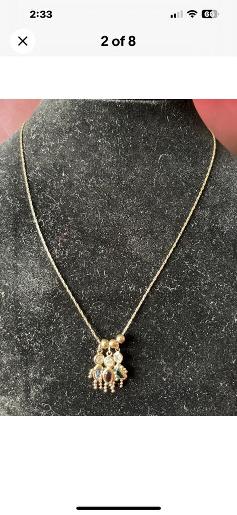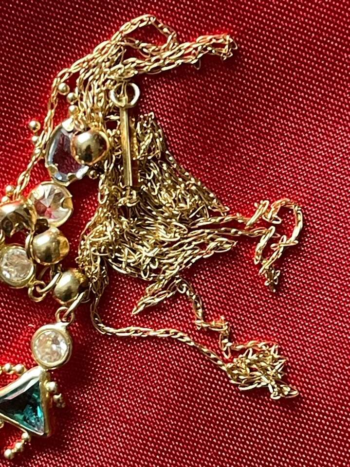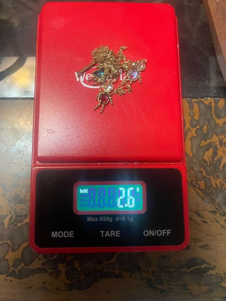 Weight 2.6 grams, has 4 gold beads (one has damage) and 6 stones. Chain length 27 stamped 14k and a crown symbol. Excellent condition, it is very beautiful and nice pendant necklace.
