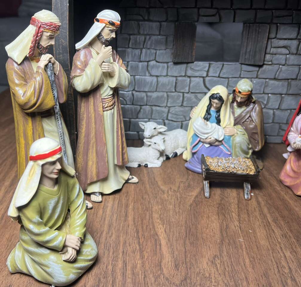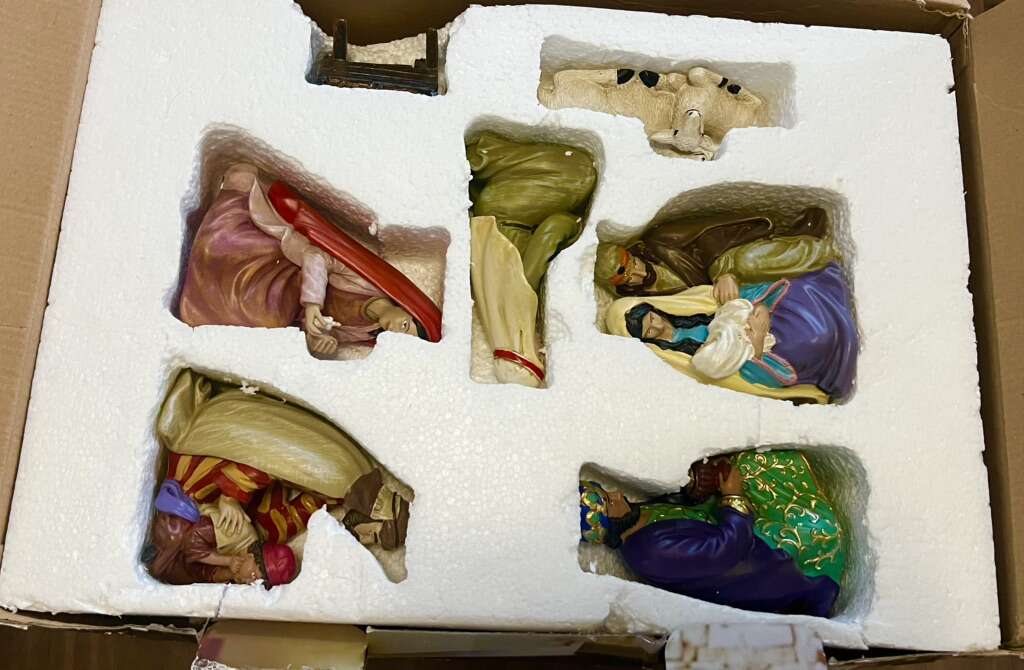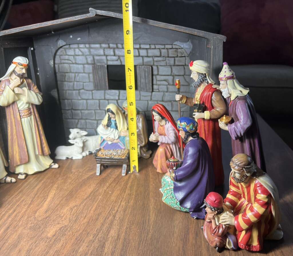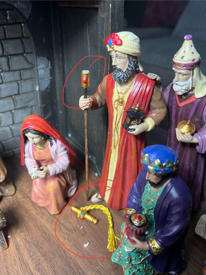 Sugarhouse Such a beautiful set! It’s in good condition, but missing one of the staffs and another one has split at the top and needs to be glued. I’ve circled it in the photo. Measurements in photos.  Cash, Venmo Text is best.