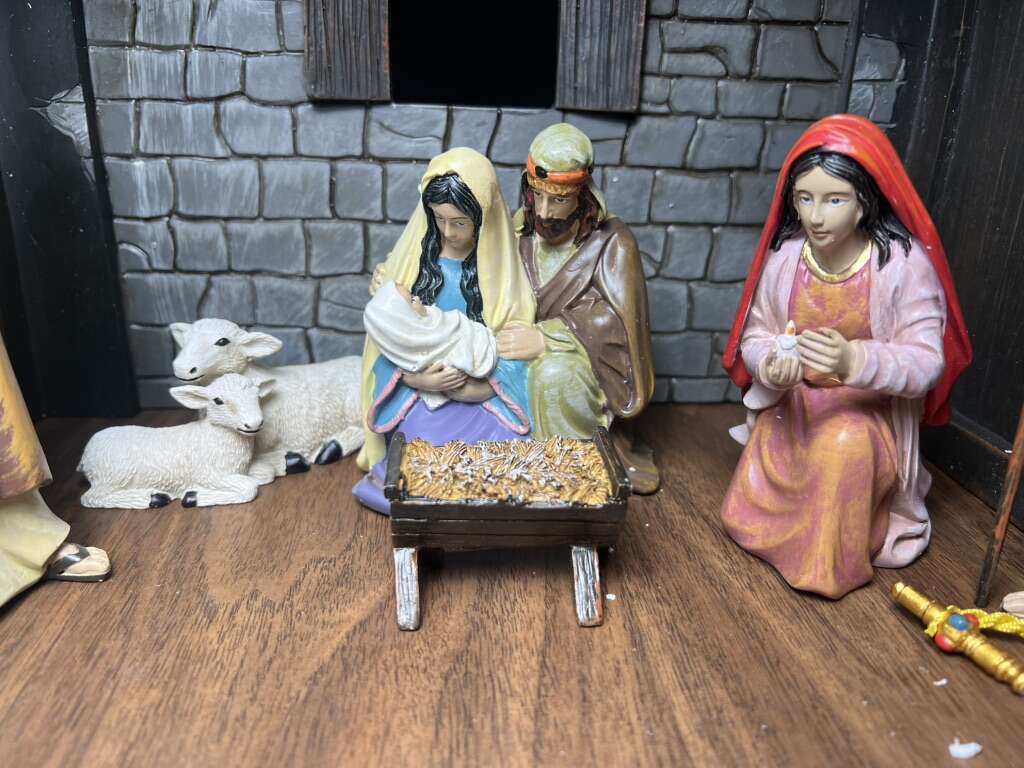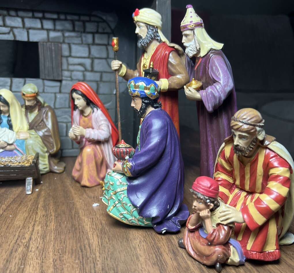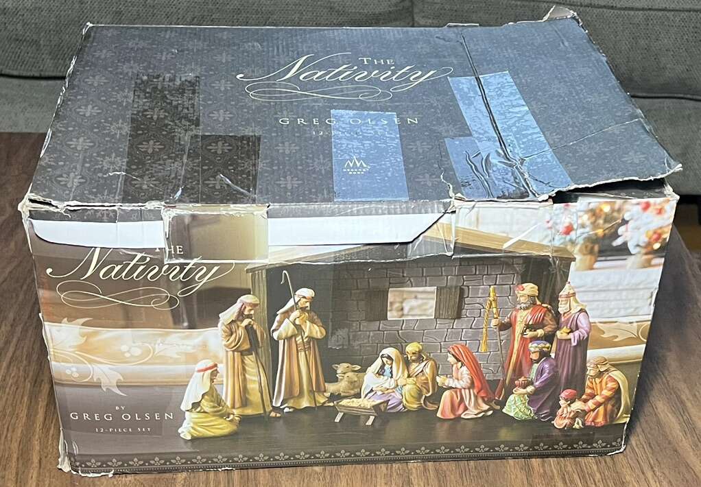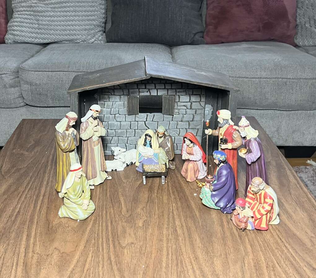 Sugarhouse Such a beautiful set! It’s in good condition, but missing one of the staffs and another one has split at the top and needs to be glued. I’ve circled it in the photo. Measurements in photos.  Cash, Venmo Text is best.