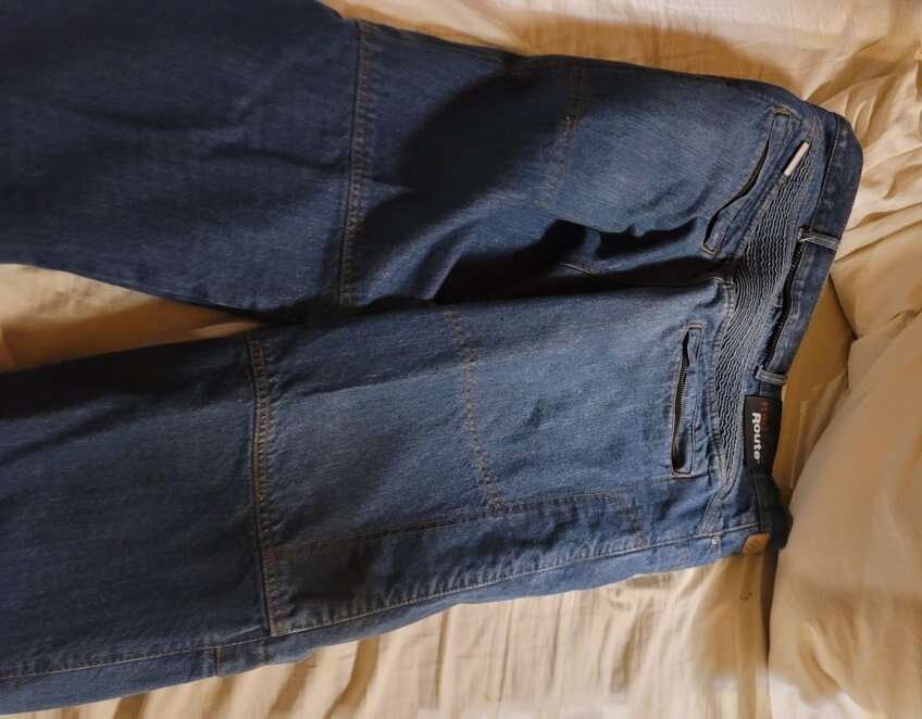 Red route Kevlar motorcycle jeans with the zip-in knee pads and hip pad pockets waste 38 inseam 34 and 1/2. Like new