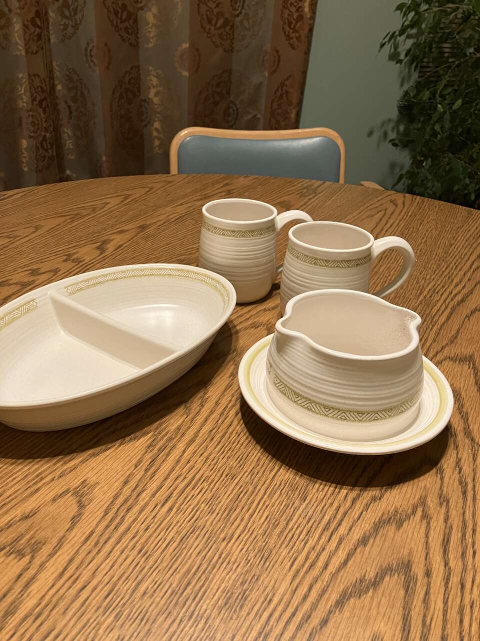 divided serving dish 7.5"x11", gravy server 6.5"w x3.5"h, 2 mugs 3.5"w x 4"h