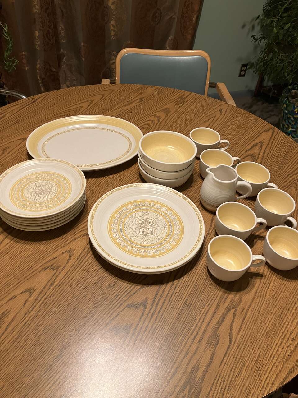 2 dinner plates 11", 6 salad plates 8.5", platter 11.5"x14", 3 bowls 6.25", 7 cups 3.75"w x2.5"h, creamer 4.5"h