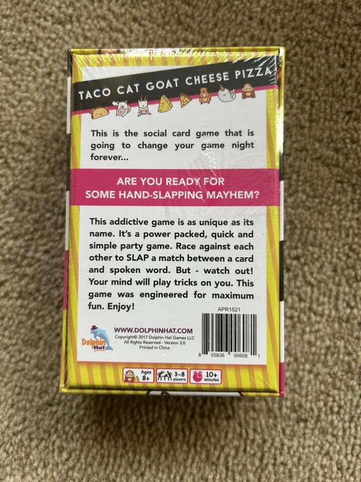 NEW (sealed in plastic) Taco Cat Goat Cheese Pizza Game. A fast-paced card game. Age 8+, 3-8 players. By Dolphin Hat, 2017. New, unopened condition. Text only. Cash or Venmo.