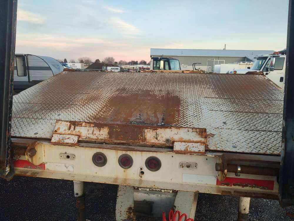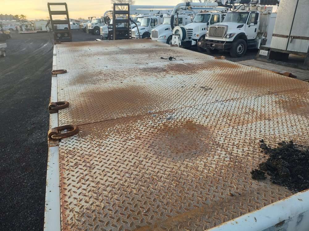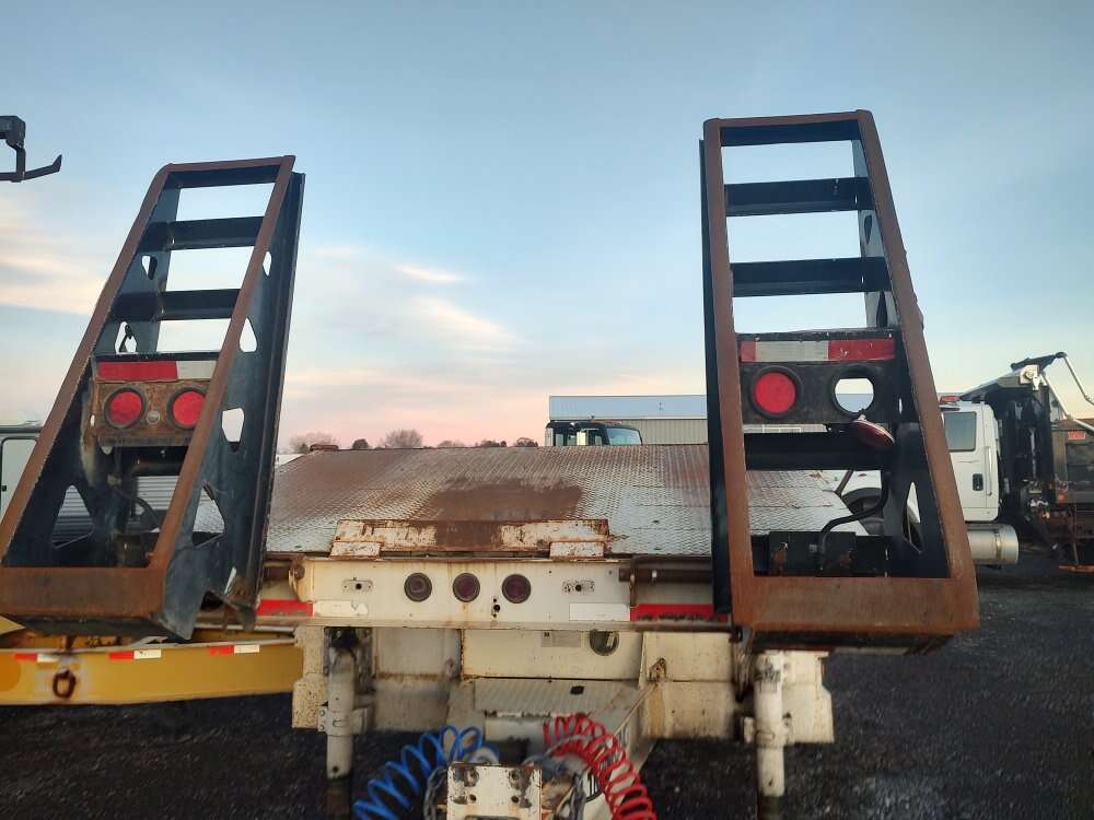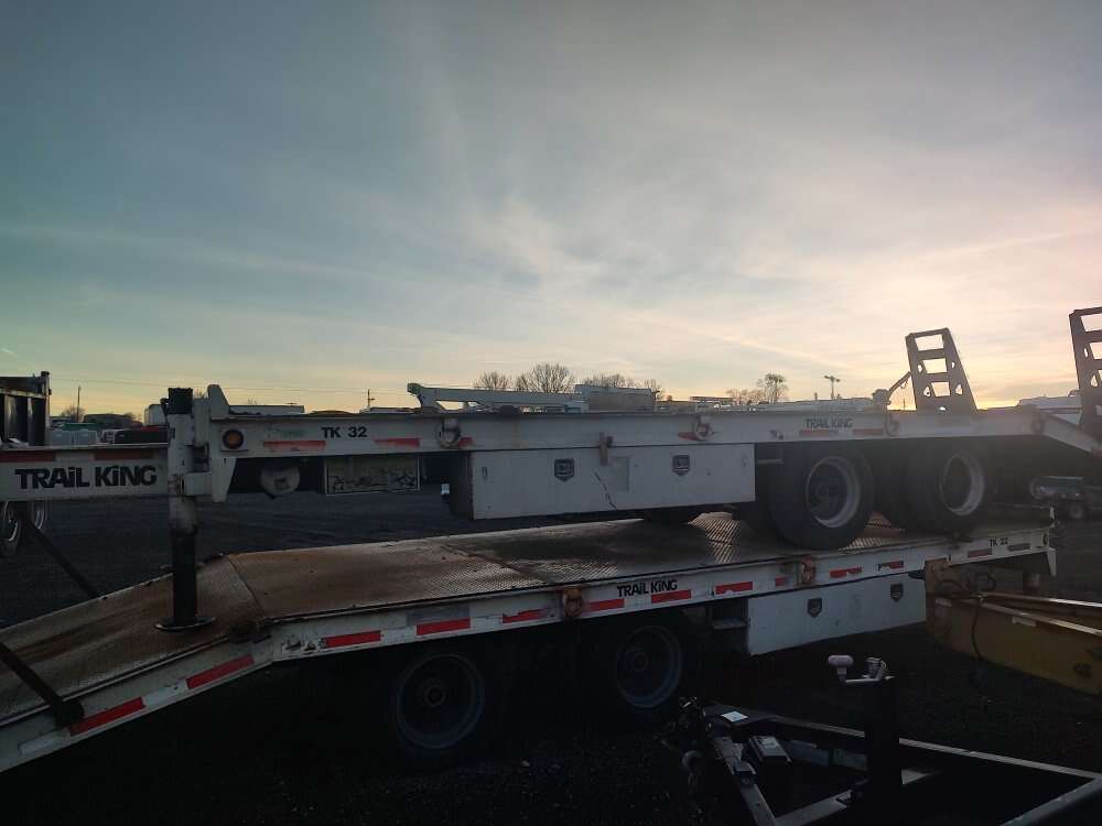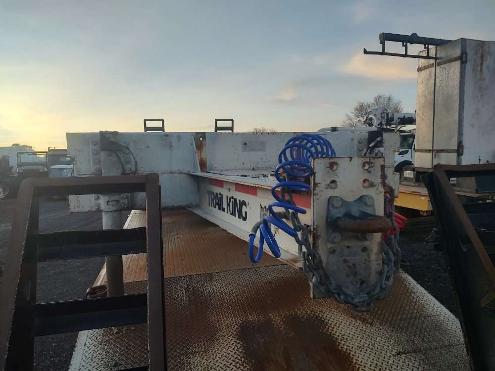 2003 Trail King 41,000GVW equipment trailer, 96" wide, 24 foot deck, rear ramps, hydraulic landing gear, good tires, good brakes, air brakes, former municipal unit 208-734-3434