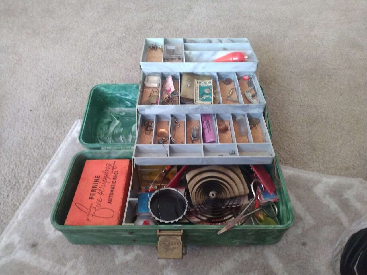 Old Plano tackle box #4250. Contains old and modern items. Has fish and game license dated