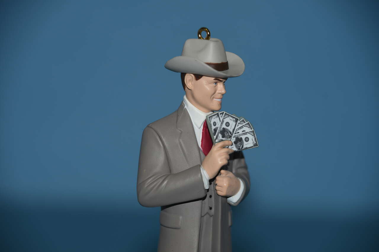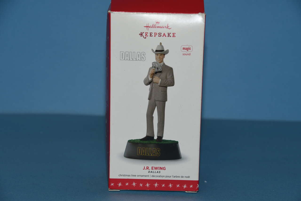 This HALLMARK JR EWING, DALLAS CHRISTMAS TREE ORNAMENT is about 5" in height. It plays the DALLAS theme song (it does not include batteries). Questions??? Please ask. We are located in Plain City. Cash only please.