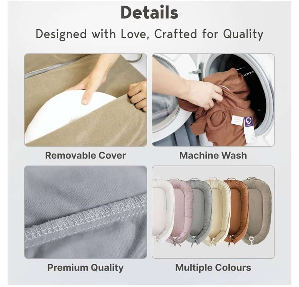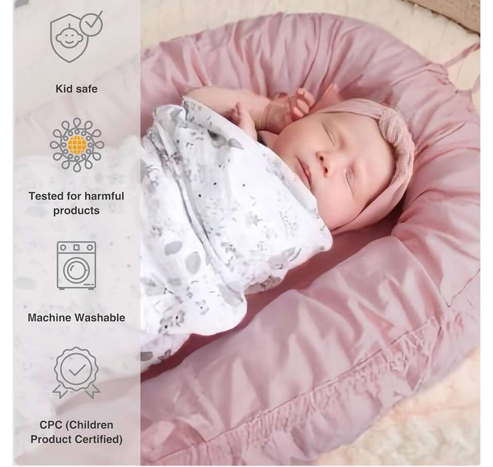 Infant Lounger, Baby Nest Cover for Boys & Girls, Newborn Essentials (0-12 Months), 100% Cotton, Breathable, Portable Co-Sleeper for Travel • Comfortable and Supportive: Provides infants with a cozy, cradled feeling, perfect for supervised activities like tummy time and sitting practice. • Adaptable Design: Features a bionic shape with a breathable, machine-washable cover that adjusts to accommodate your baby’s growth. • Quality and Safety First: Made from organic, non-toxic, hypoallergenic materials. Certified by OEKO-TEX, CPC, and CPSIA standards. • Ethical Production: Crafted responsibly using sustainable practices, perfect for families who value minimalism and eco-friendly products. • Interactive Use: Ideal for engaging with your baby during activities and playtime.