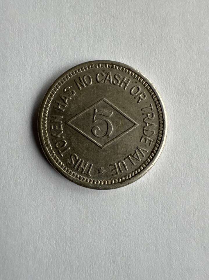 One side lists an amount of 5 and says “GOOD FOR AMUSEMENT ONLY”. The other side lists an amount of 5 and says “THIS TOKEN HAS NO CASH OR TRADE VALUE”.