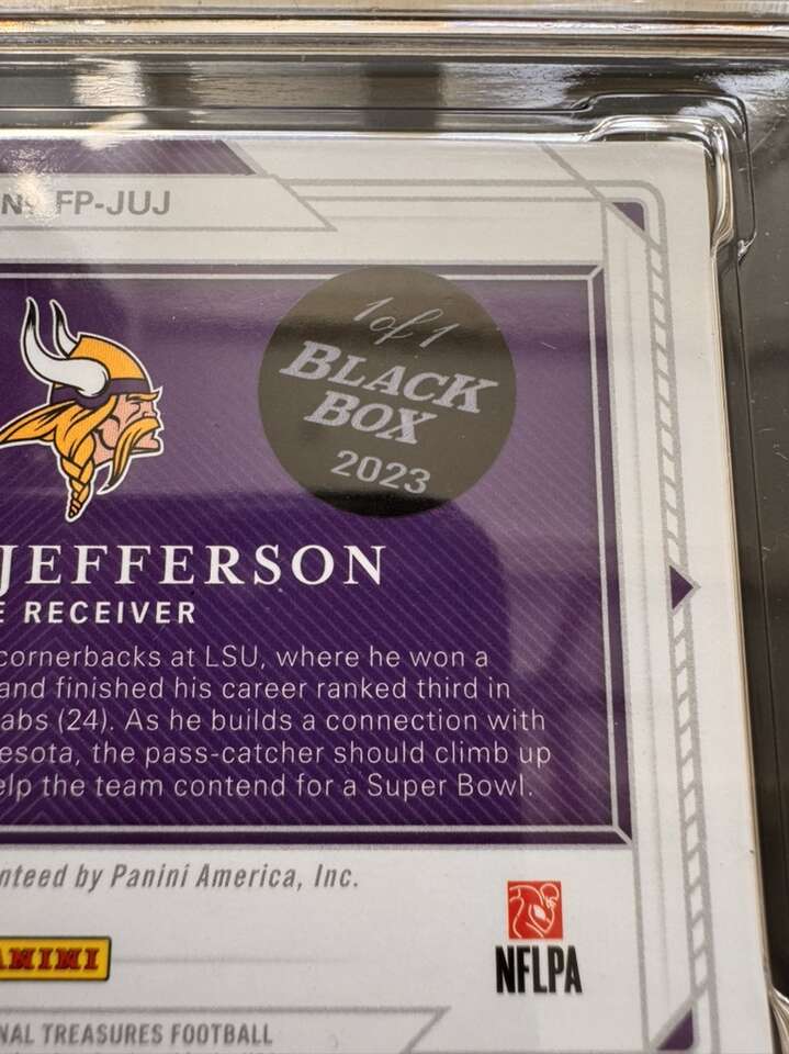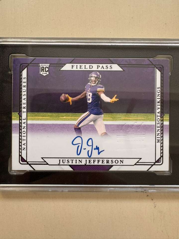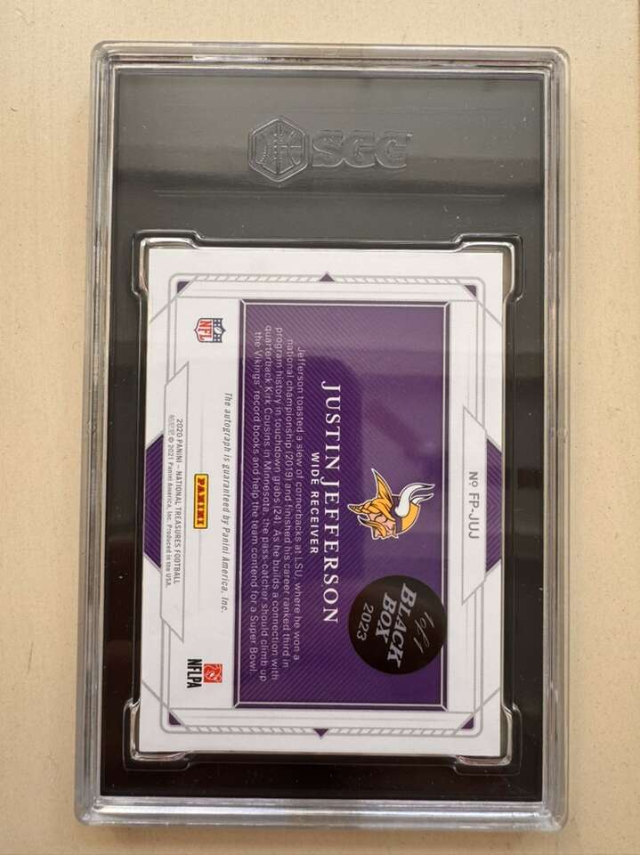 2020 National Treasures Justin Jefferson Rookie Field Pass Auto ‘23 Blackbox 1/1 SGC 8.5/10 Vikings