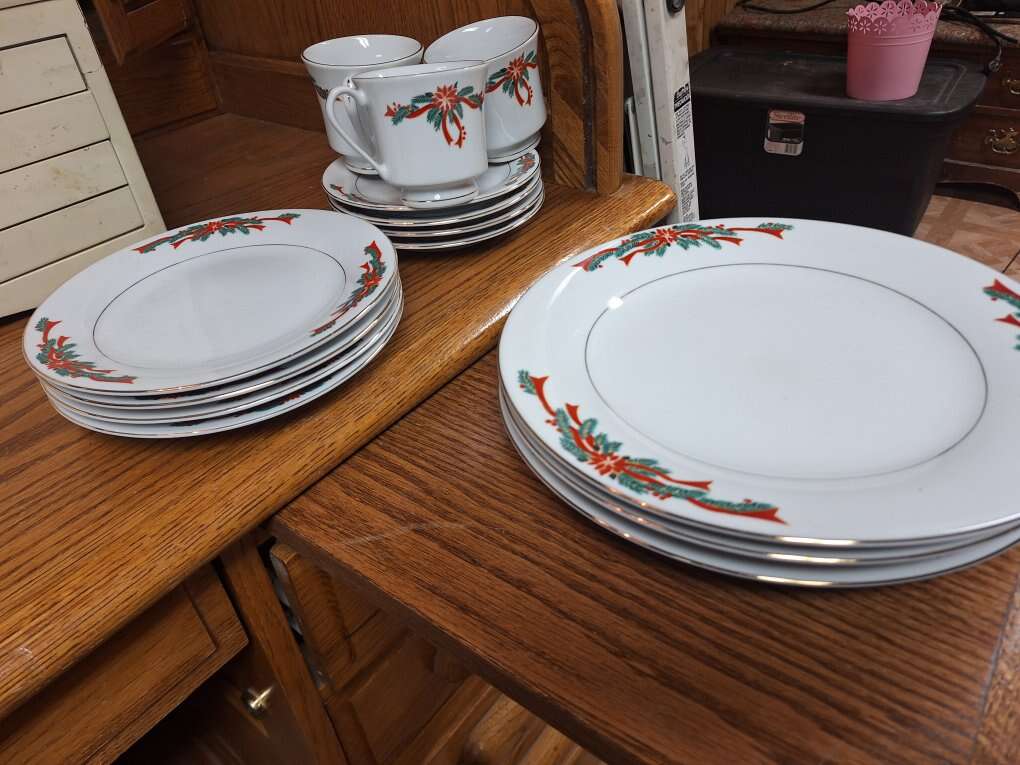 christmas.place setting 3 cups 4 cup plates 4 small plares 3 big plates