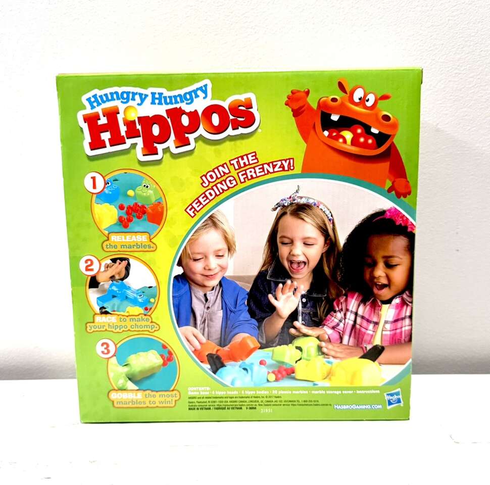 Contents: Game base 4 hippo heads 4 hippo bodies 20 plastic marbles Marble storage cover Instructions Brand new
