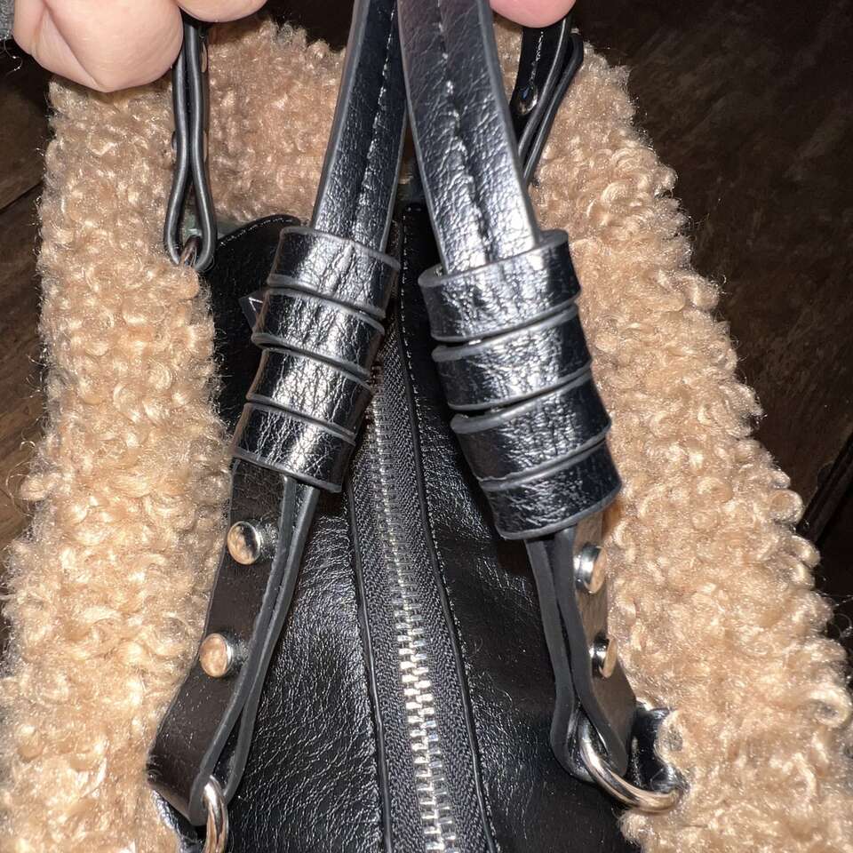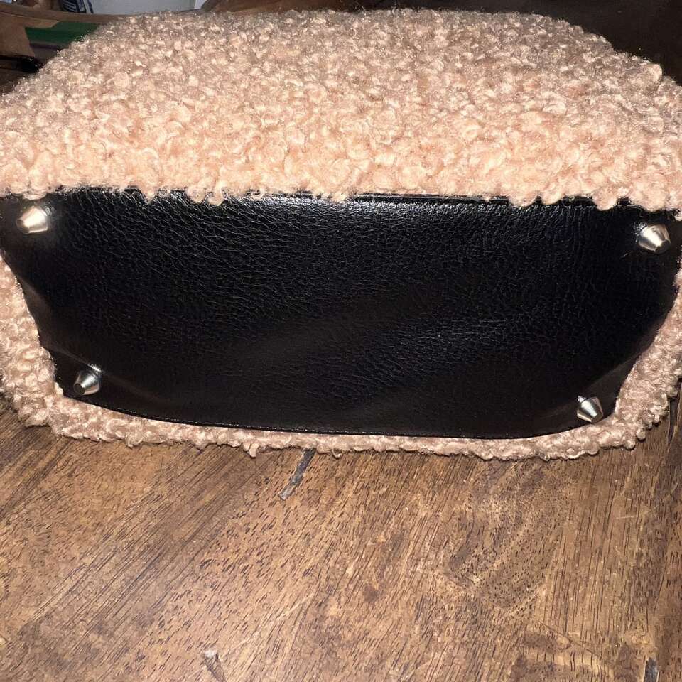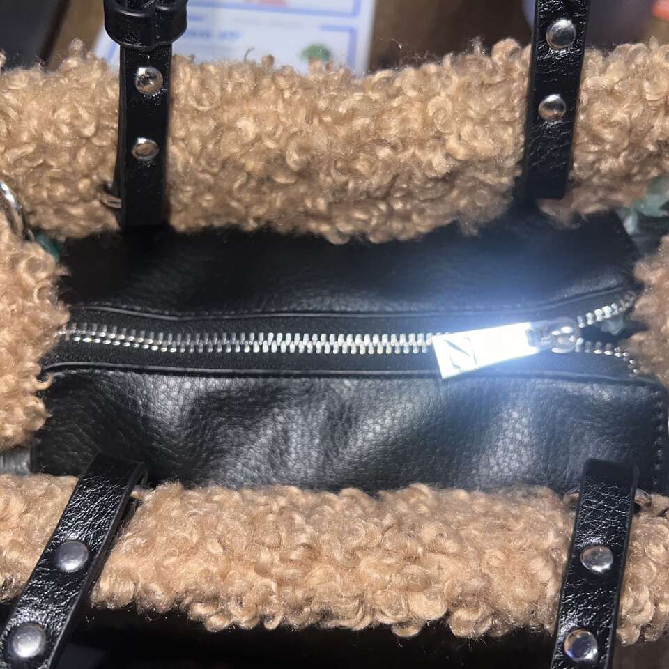Plush, textured faux fur (sometimes referred to as teddy or sherpa) exterior in a neutral tan/camel color Black, faux leather accents - double strap handles, top of bag at closure, and bottom of bag 2 interior compartments - one of the compartments has a side slip pocket Zipper closure Metal feet on bottom Lightweight