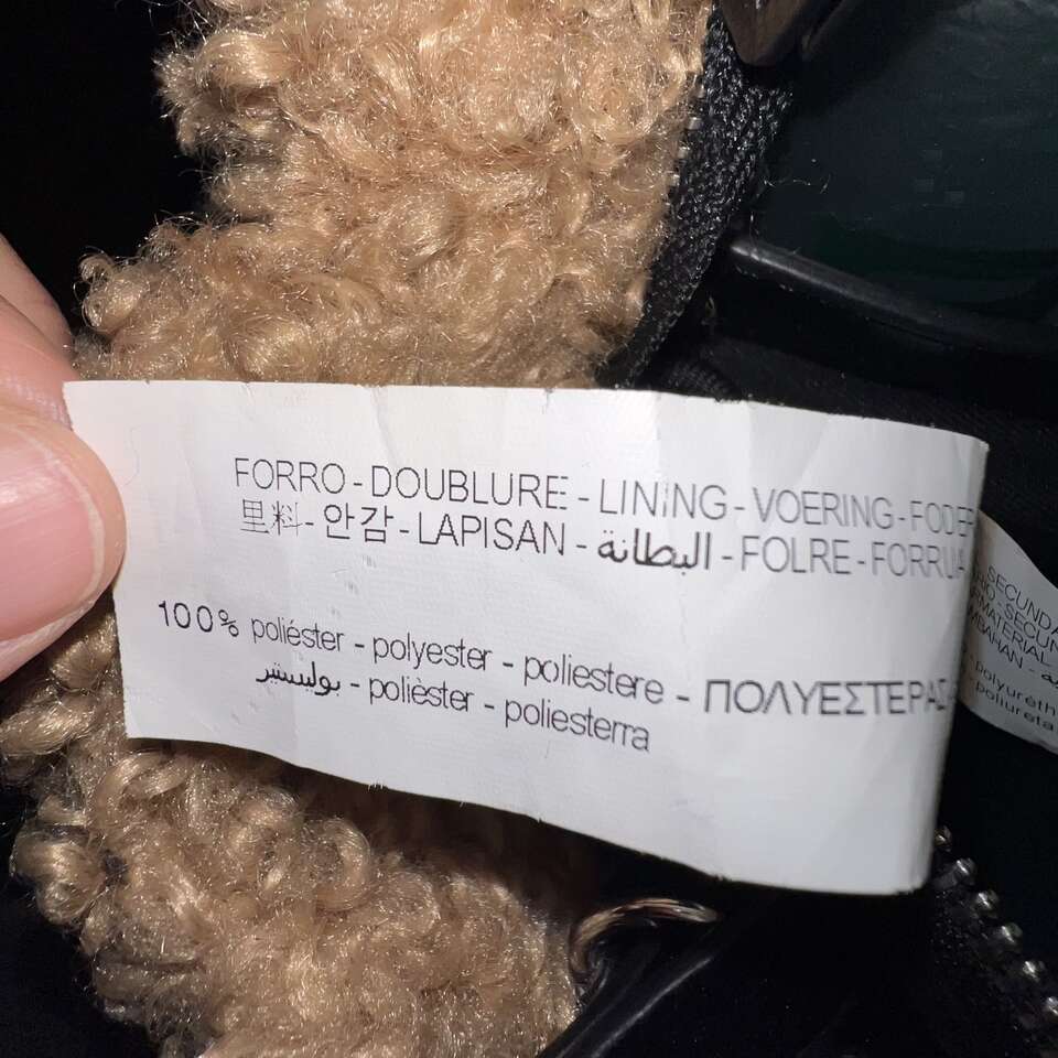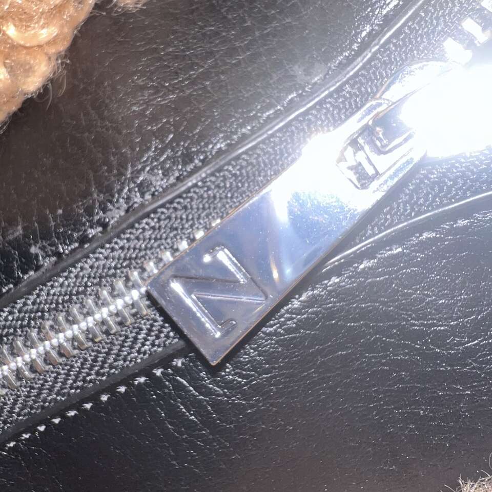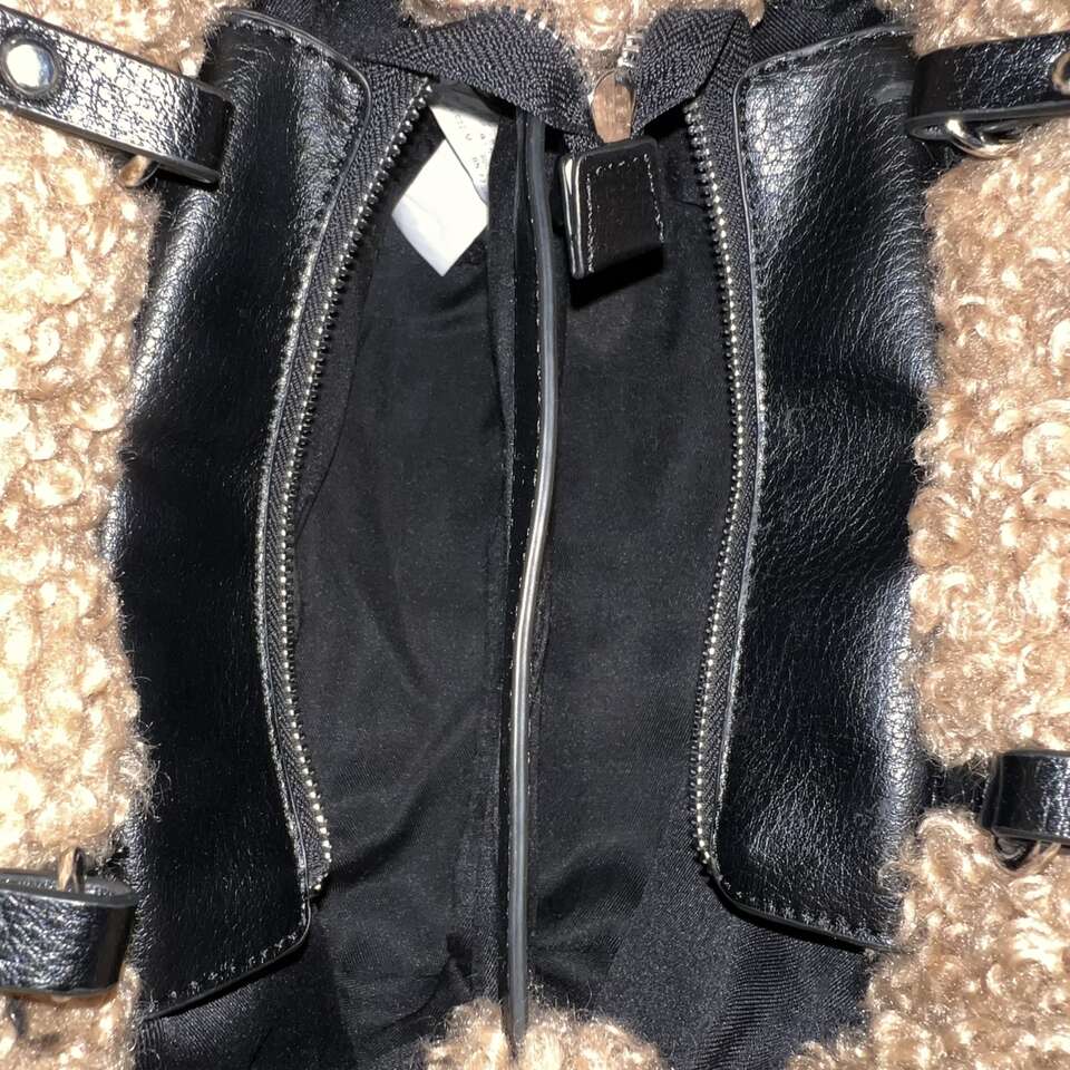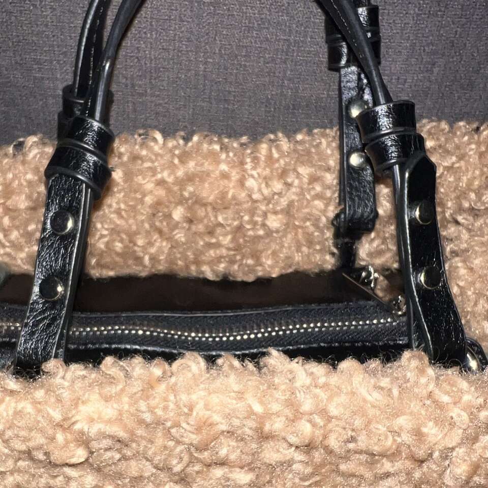 Plush, textured faux fur (sometimes referred to as teddy or sherpa) exterior in a neutral tan/camel color Black, faux leather accents - double strap handles, top of bag at closure, and bottom of bag 2 interior compartments - one of the compartments has a side slip pocket Zipper closure Metal feet on bottom Lightweight