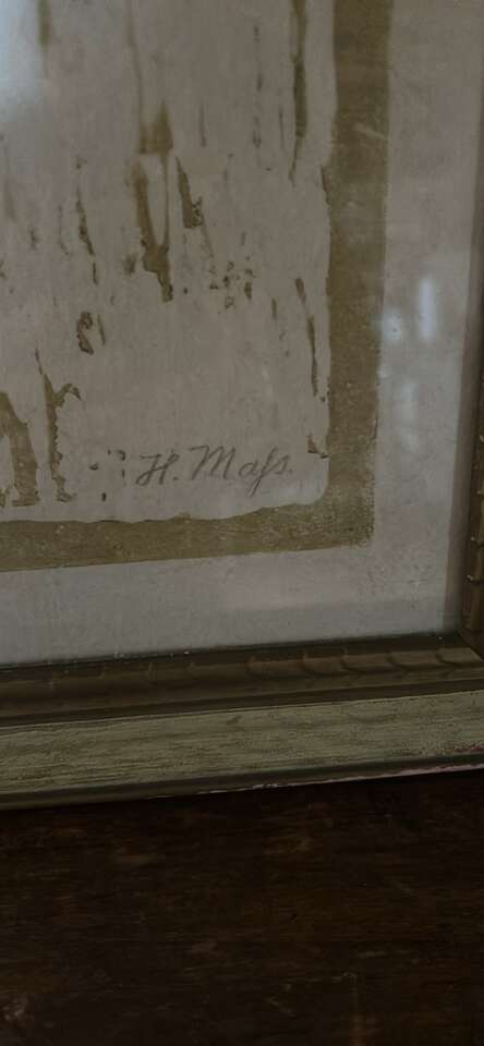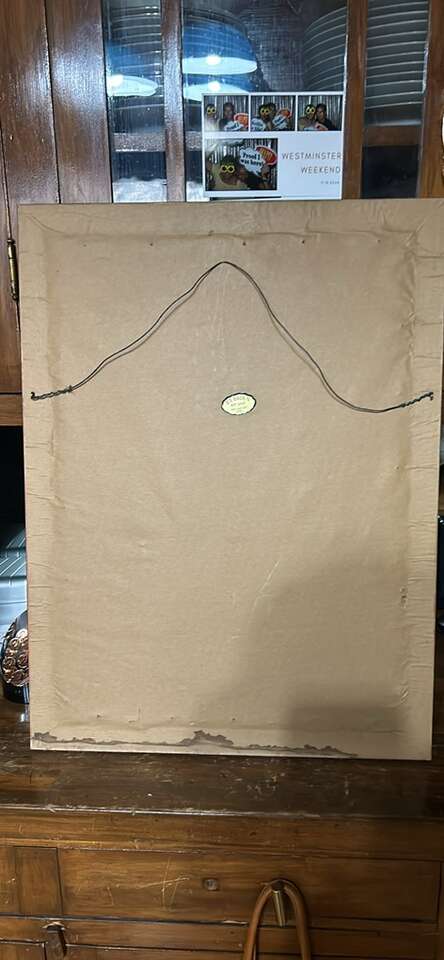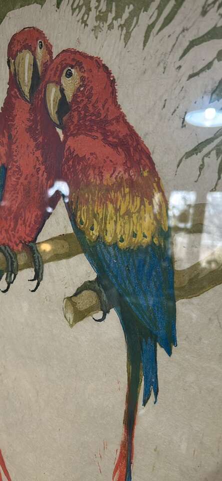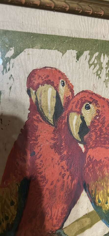 Original VTG. Woodblock print with hand colored parrots. Signed 24”X18”
