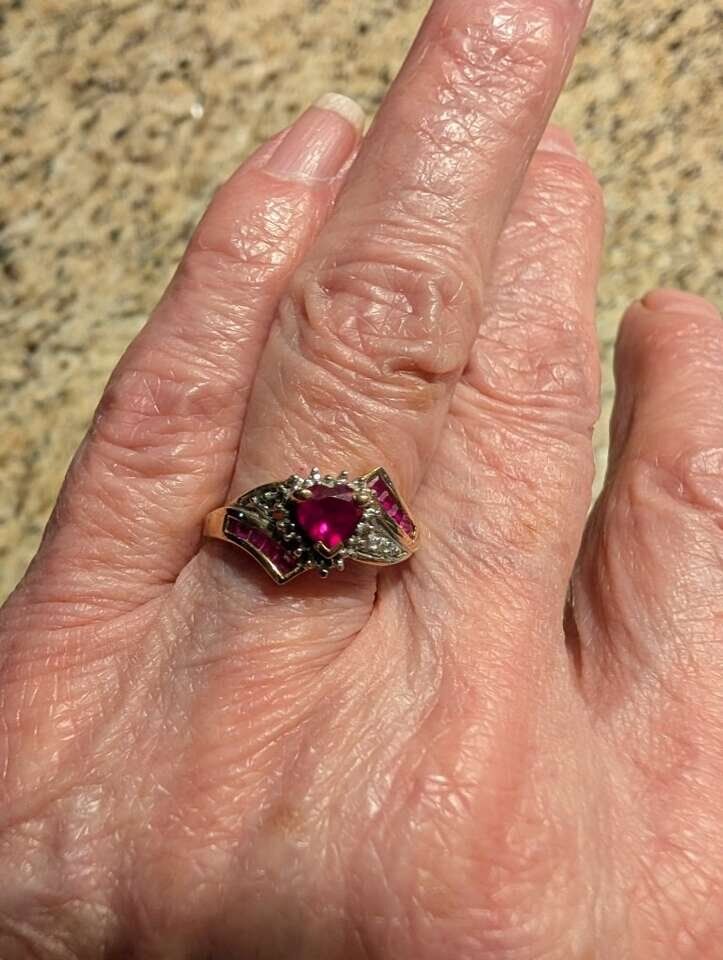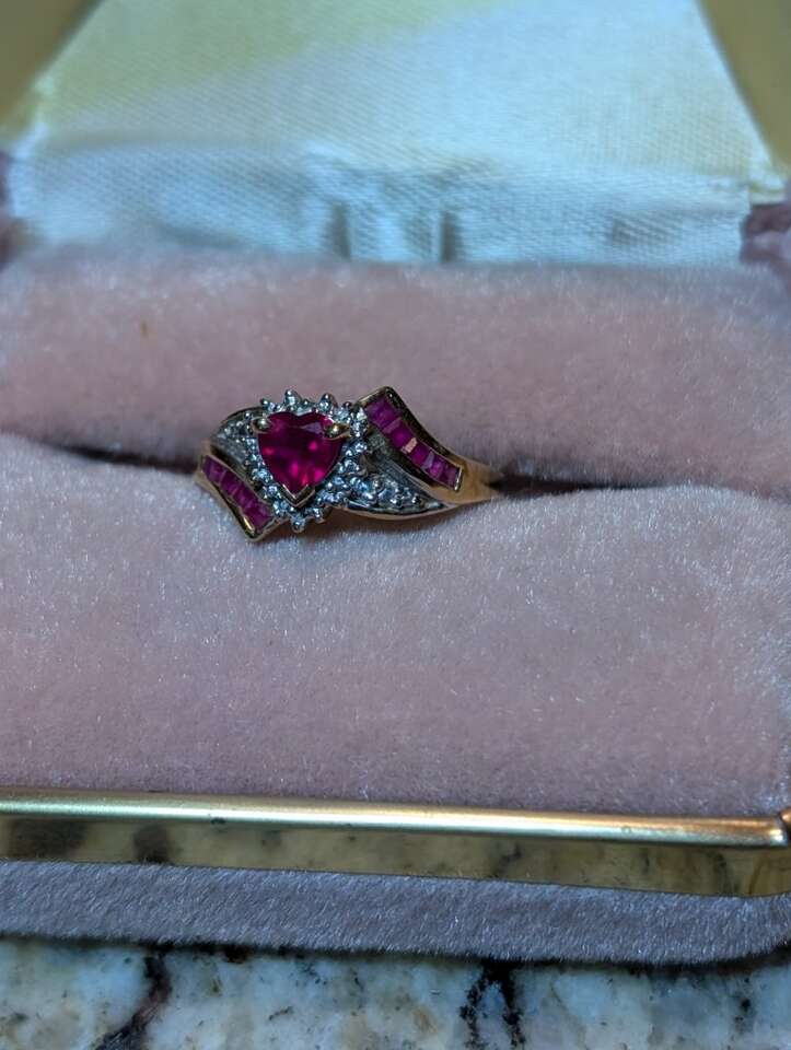 Heart shaped ruby center stone surrounded by diamonds and baquette rubies. Size 7 It is set in 10K gold. Asking $650 obo