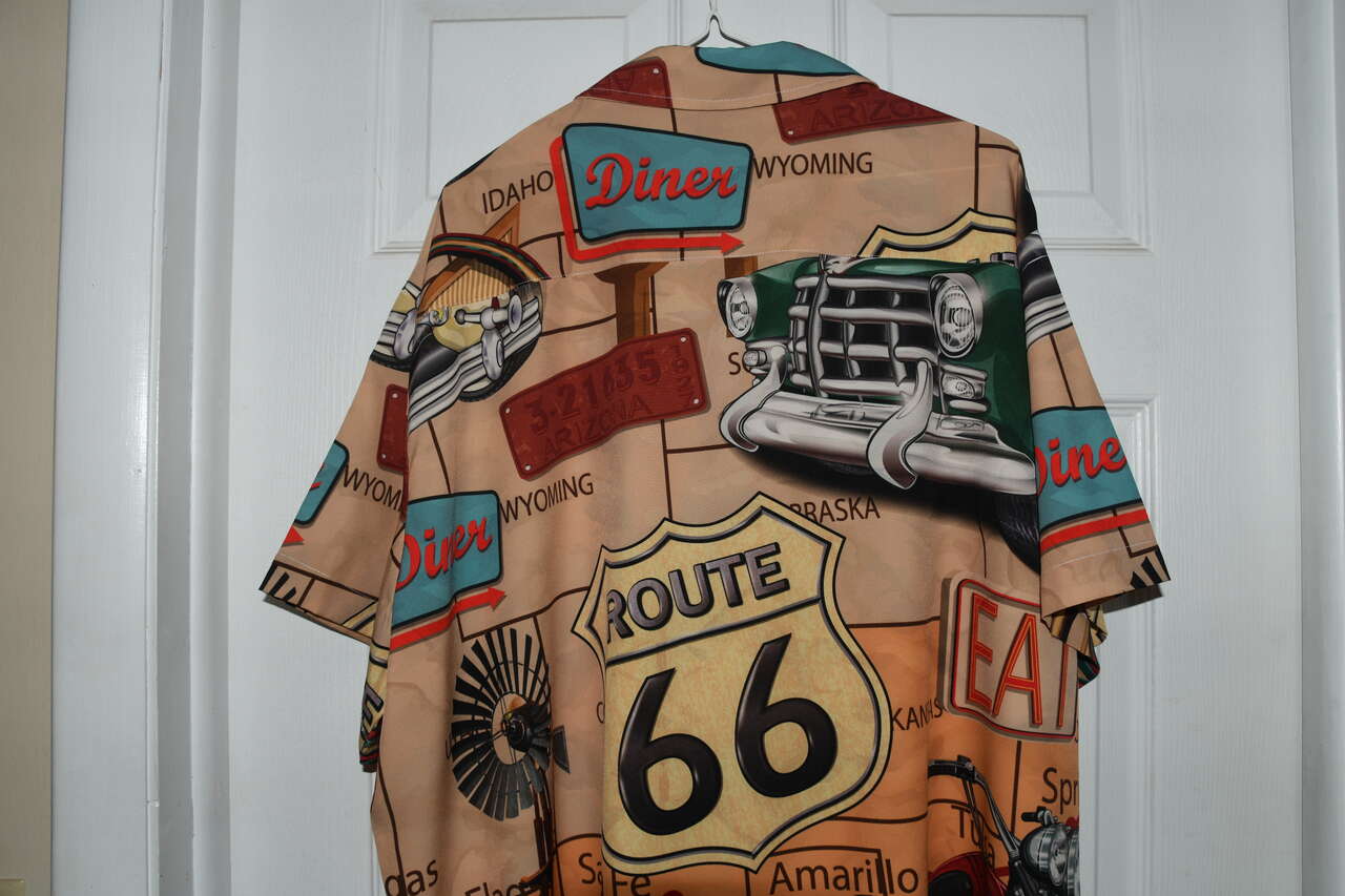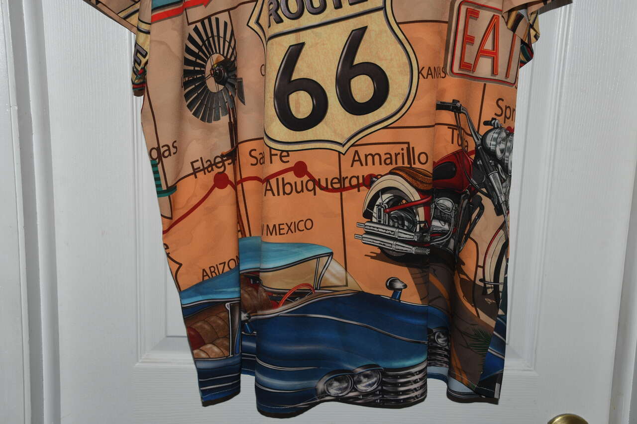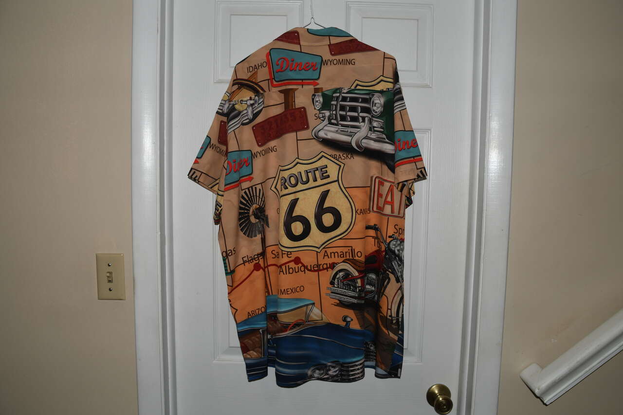 This MEN'S ROUTE 66 SHIRT is size 2XL. It is 95% polyester & 5% spandex. The is short sleeve & button down. It is about 26" across the chest area. Questions??? Please ask. We are located in Plain City. Cash only please.