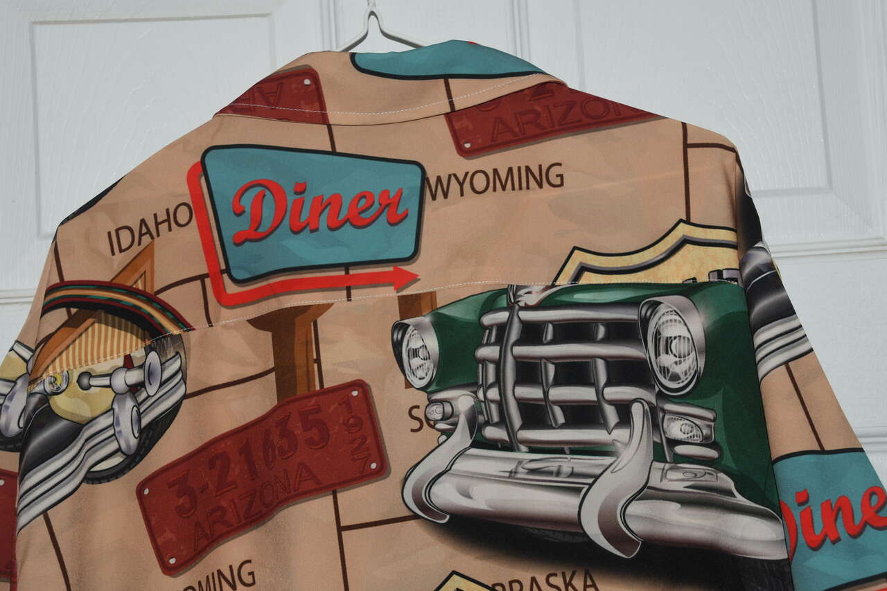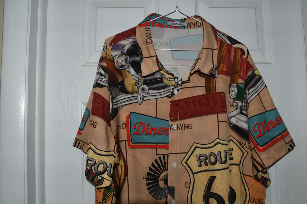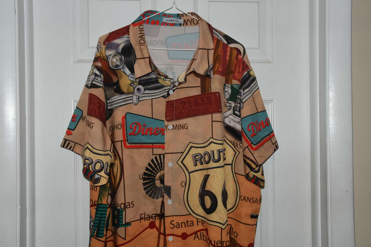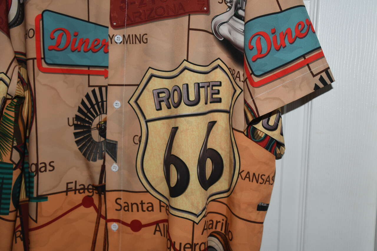 This MEN'S ROUTE 66 SHIRT is size 2XL. It is 95% polyester & 5% spandex. The is short sleeve & button down. It is about 26" across the chest area. Questions??? Please ask. We are located in Plain City. Cash only please.