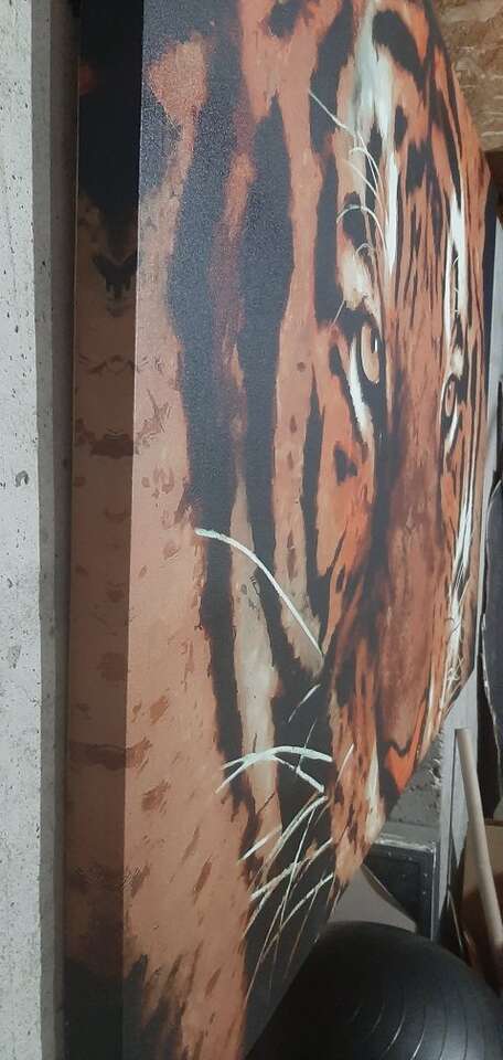 Very good condition large canvas painting/print close up of tiger eyes & whiskers. Oranges, black, browns, white... measures almost 5 foot x 3 foot (actual measurements: 59in x 39.25in x 1.5in). Just been hanging in the corner of my basement and needs a new home. Smoke free environment.