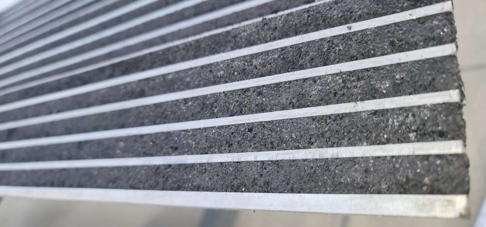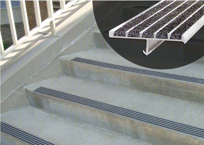 Material Extruded Aluminum Depth 3 in Width 60 in Installation Method Set in Concrete Thickness 1/4 in Surface Design Multi-Strip Grit Indoor/Outdoor Indoor; Outdoor Nose Height 1/4 in Includes Hold Anchor For Surface Type:Embedded in New Concrete; Steel Pan Stairs ADA Compliant Yes Resistance Properties Corrosion Resistant Series Supergrit® 231BF Standards Federal Test Method Standard No. 501a. Method 6411 Stripe Pattern Straight Stripes Traffic Type: Heavy Manufacturer Part Number 231BF-5 Series: Supergrit(R) 231BF Installation Equipment Included Yes Nose Style Square Product Type Anti-Slip Stair Nosing Number of Grit Strips 5UNSPSC31201513 Country of Origin USA (subject to change) Product Description Multistrip grit on these stair nosings has gaps between the gritted surfaces to increase wear resistance and allow dirt and moisture to drain off the surface.