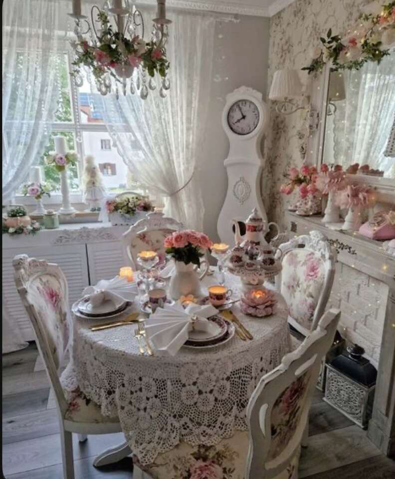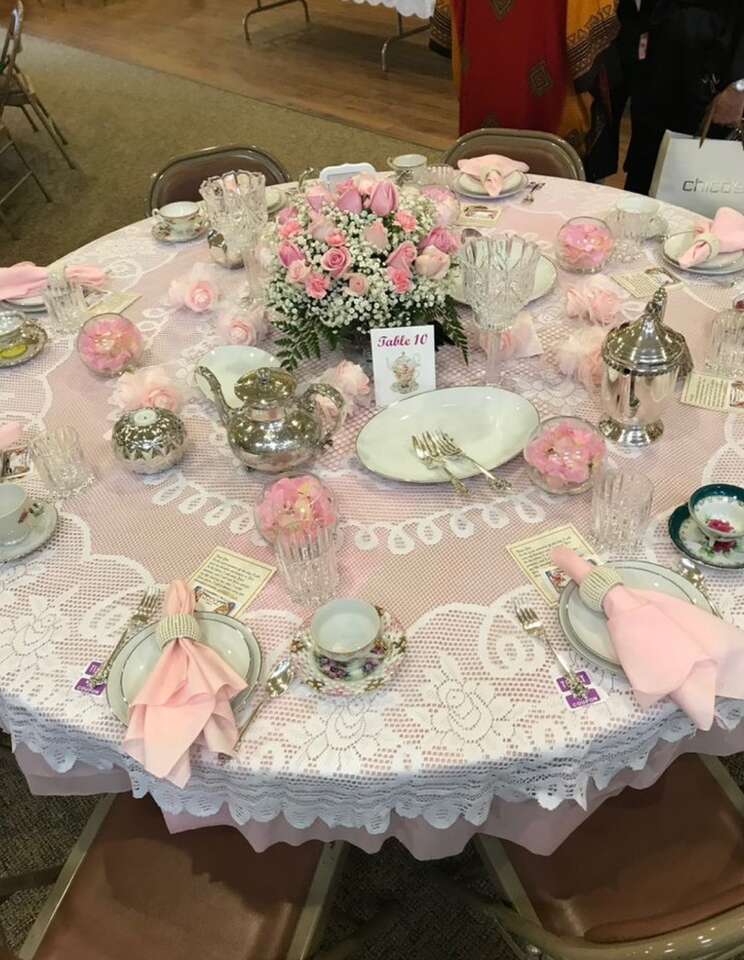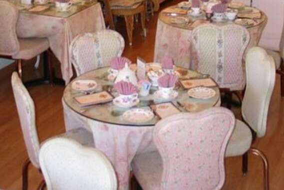 Each place setting includes: Cup and saucer Medium snack plate Doily Flatware Linen napkin and napkin ring Crystal drinking glass