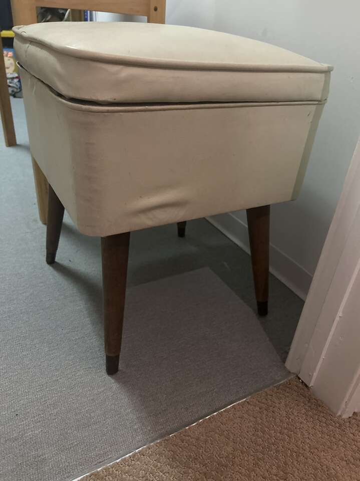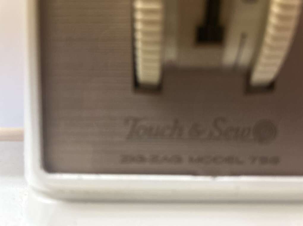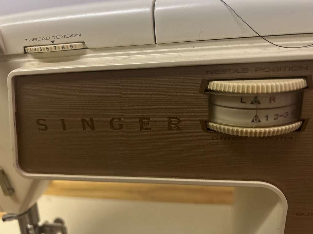 1968 Singer zigzag sewing machine with foot pedal and attachments and table with drawer. Storage bench