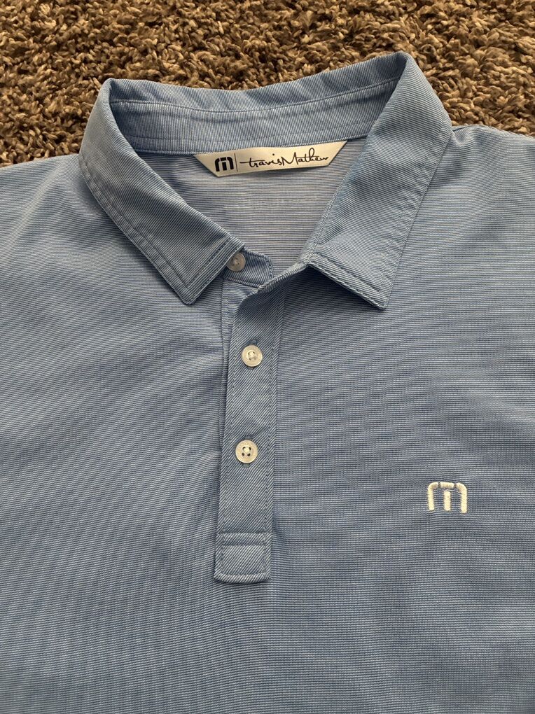 The top row is : Travis Mathew, light blue Travis Mathew, denim Levi blue Travis Mathew (grey with black color and small blue stripes)
