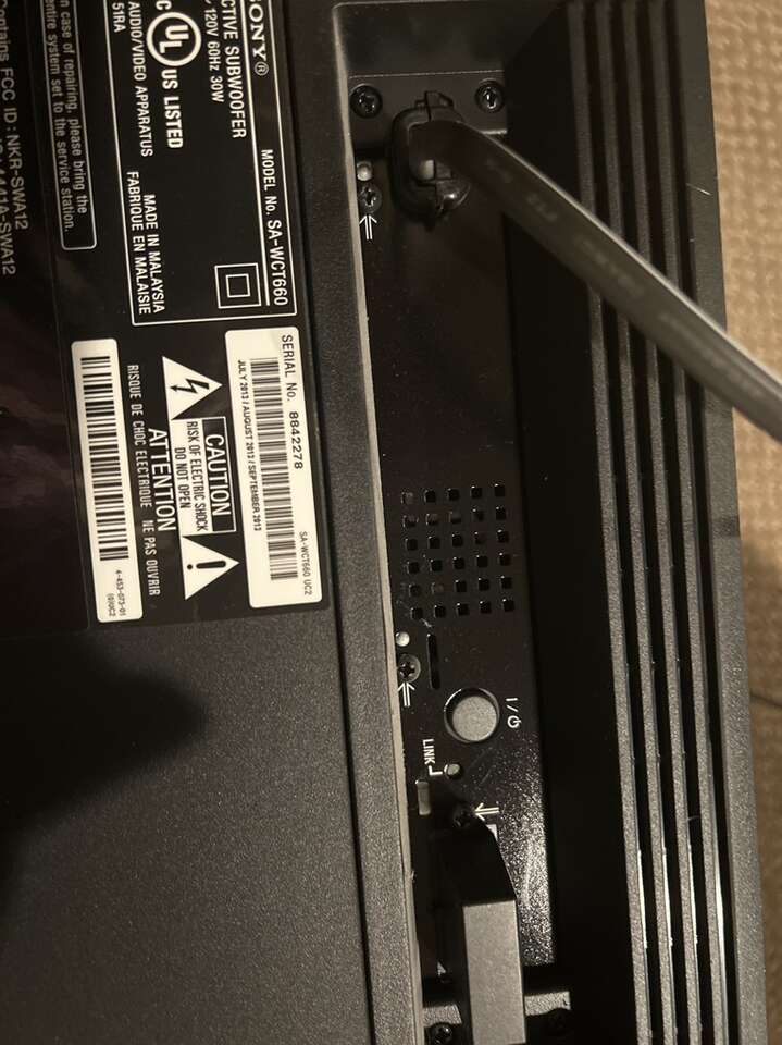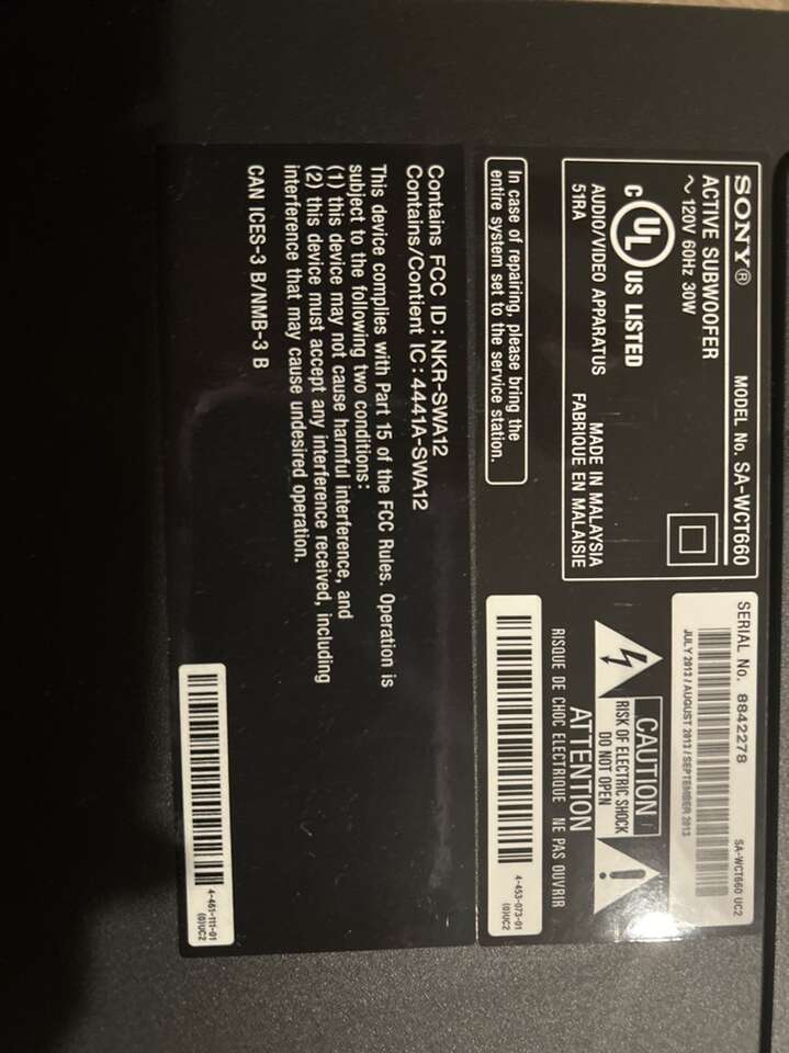 Model number, SAWCT660 single speaker 120 V 60 Hz 30 W. Speaker measuring 16 x 12 x 12.