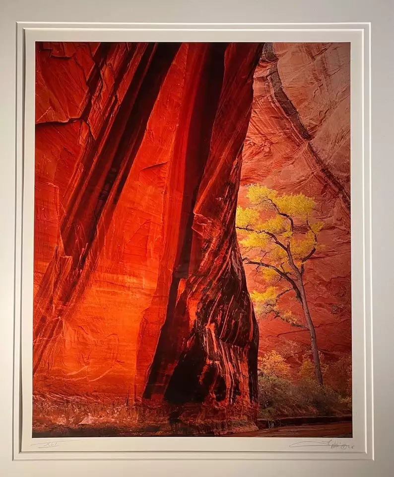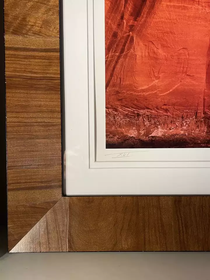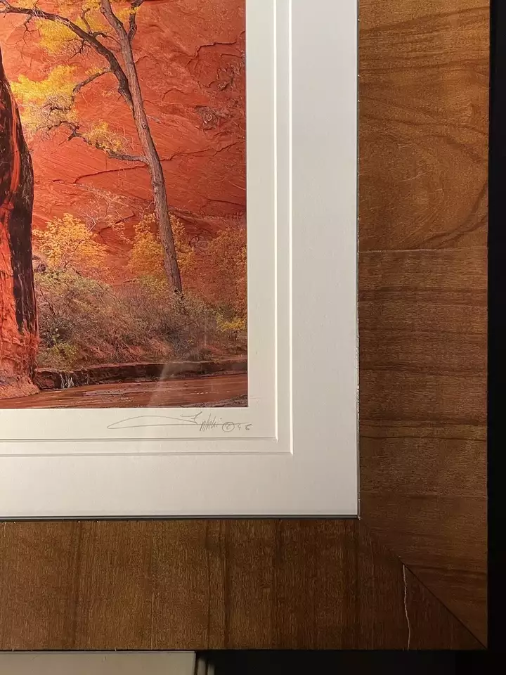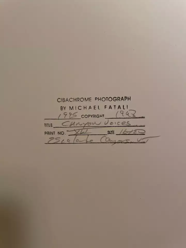 VenmoThis listing is for an authentic cibachrome print from Michael Fatali titled “Canyon Voices”. It is print number XLI, photographed in 1995 and printed in 1998. The proof of authenticity is stamped on the back of the mount board. I had the print reframed in a Roma Tabacchino Tobacco Leaf frame. The print measures 16x20” with a framed size of 26x30”. Free shipping in the U.S.!