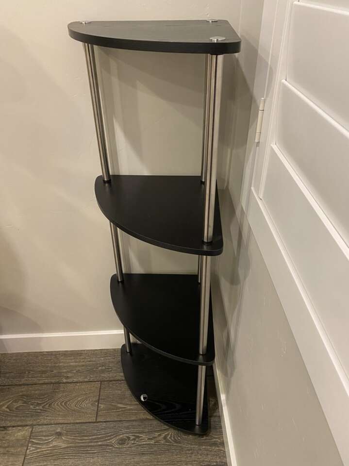 Black 4 Tier Corner shelf. Great for decorating a living space or office.