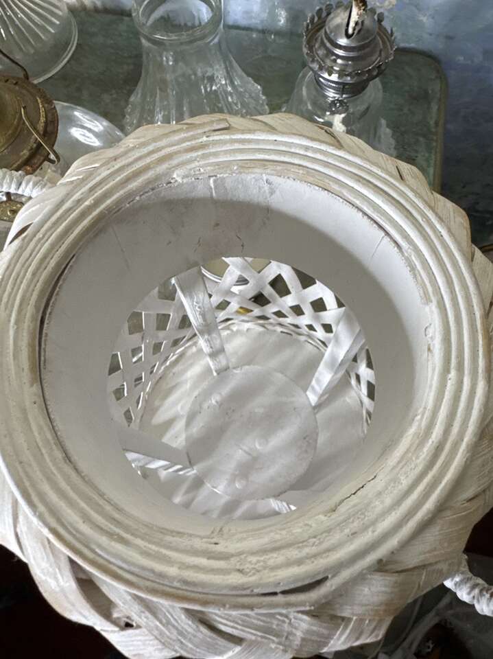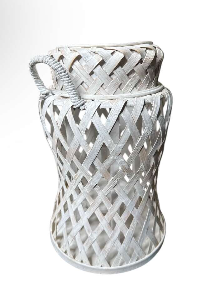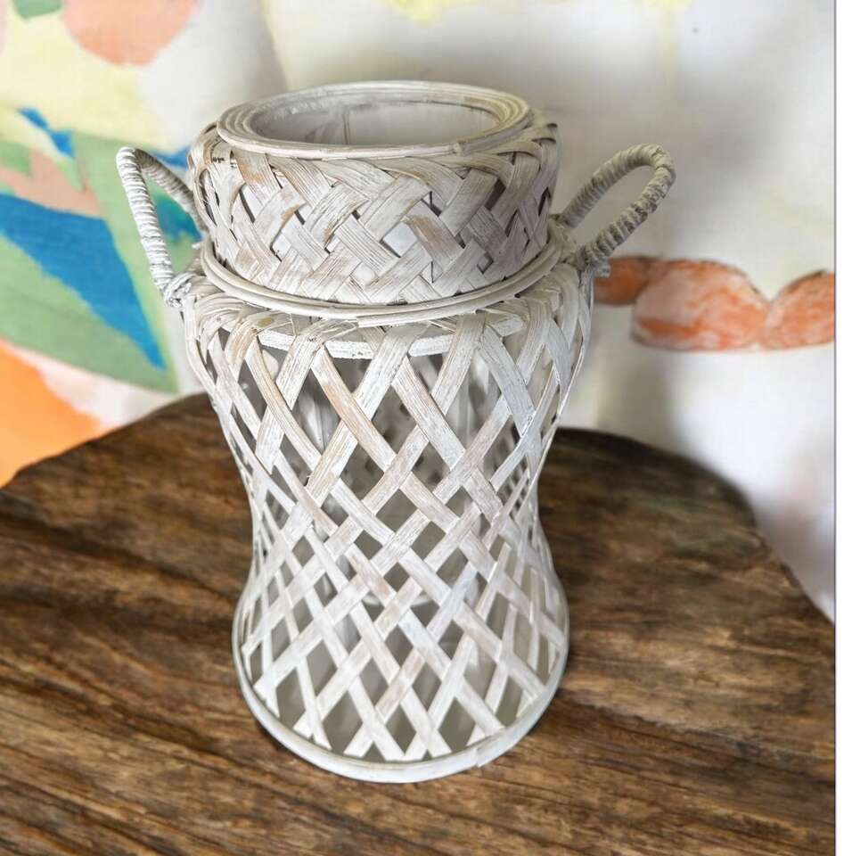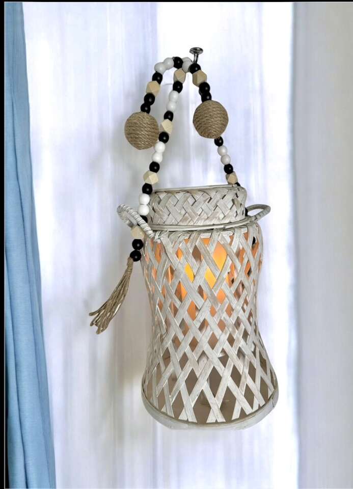 Venmo13” tall I used a tall battery candle it’s clean in excellent condition can be used outside or inside made from wood and bamboo. Extra strong has a carriage inside to hold the candle.