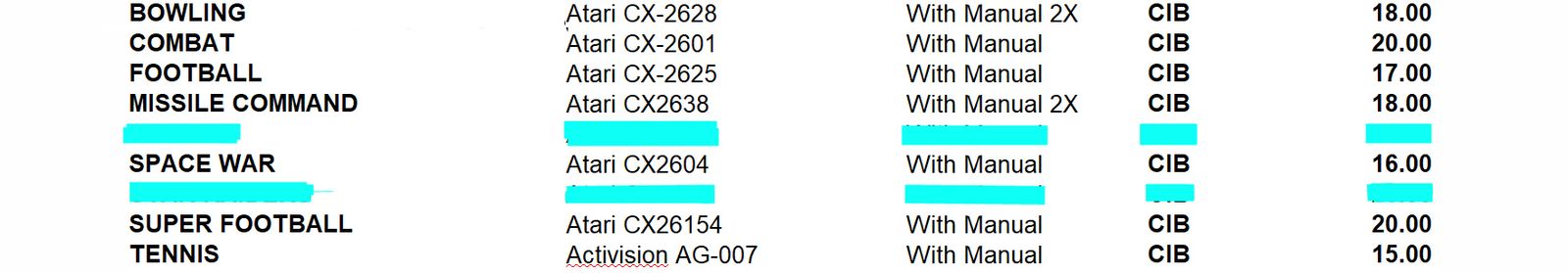 7 CIB different games for the Atari 2600 console (See the list included with the pictures for individual prices). Each box is protected with a clear plastic sleeve