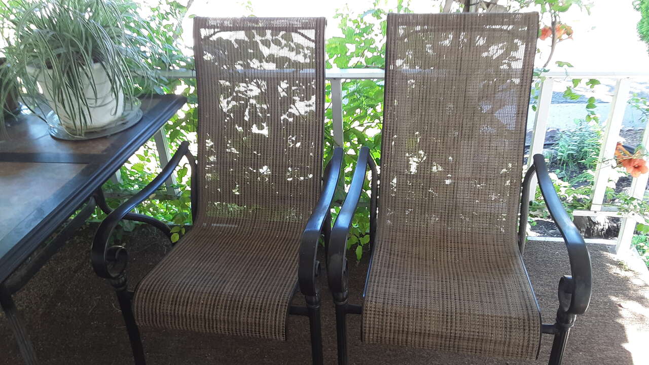 table metal black with (4)ceramic tile top, slot for umbrella(umbrella not included). 2 chairs